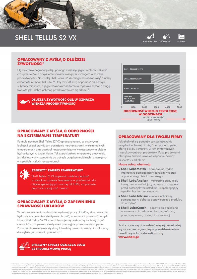 - Shell Tellus S2 VX дозволяє значно збільшити інтервали між замінами, що знижує витрати на обслуговування. Володіє високою стійкістю до термічного і хімічного розкладання, що зводить до мінімуму утворення відкладень і шламів, забезпечуючи більш високу чистоту гідравлічних систем. Він також демонструє дуже хорошу стабільність в присутності води, завдяки чому забезпечує тривалий термін служби і запобігає корозії і іржу елементів систем, що працюють в сильно вологих середовищах. Модифікатори в'язкості, стійкі до зсувних сил, зменшують зміну в'язкості масла протягом усього терміну його служби.е>