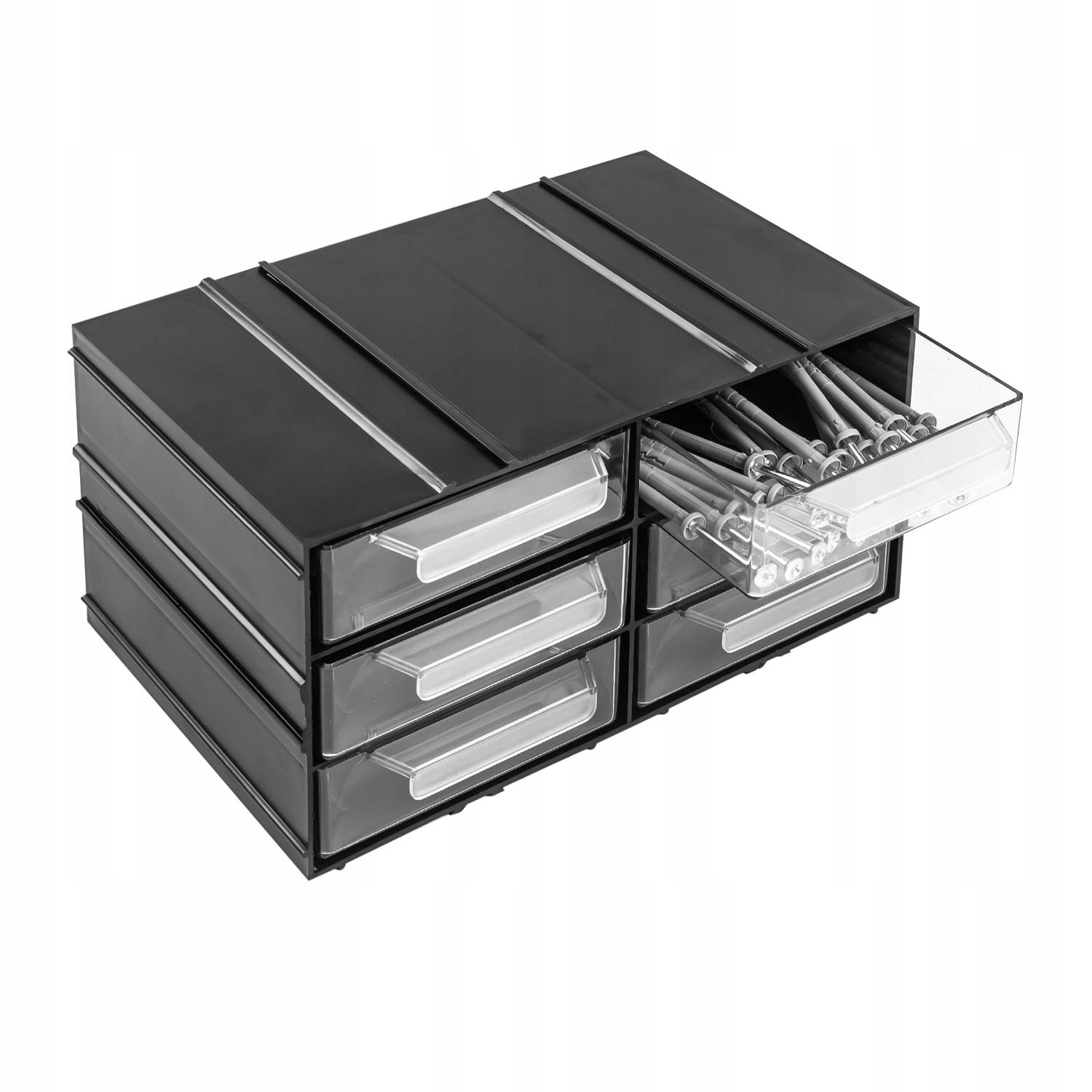 шафа, що складається з 18 прозорих ящиків. Відмінне рішення, коли Вам потрібно зберігати дрібні елементи, наприклад, електронні компоненти, гвинти, деталі, гайки, шайби, камені, заготовки, монети, марки, гачки та інші види дрібниць. Модулі, можуть з'єднуватися один з одним у великі набори за допомогою спеціальних шліців. Модулі можна повісити на стіну або поставити на стіл. Корпус чорного кольору (поліпропілен), прозорі ящики (полістирол).е>