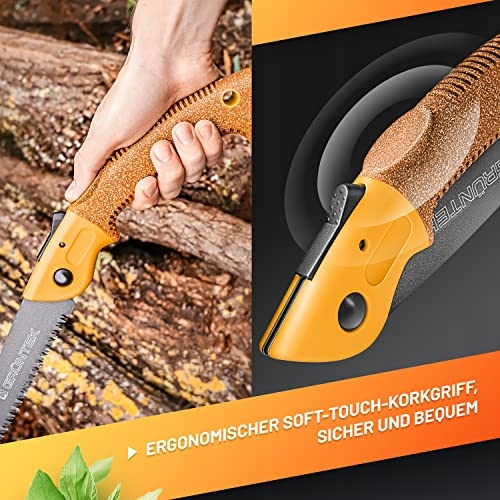 Складна пила GRÜNTEK Sander, загартована вуглецева сталь, пилкове полотно 180 мм, неслизька пробкова ручка, тефлонове покриття з 4 положеннями, ідеально підходить як садова пилка, кишенькова пилка, пилка для гілок