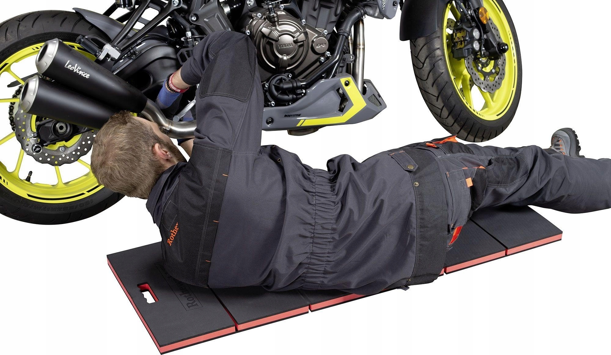 гарна ідея! Складний, легкий робочий килимок або килимок, подібний до цього Rothewald. Це робить навіть гвинти в нижній частині мотоцикла веселими. Жарт з цим килимком-можливість зібрати деталі 6 разів. Ви можете розслабитися на ньому, стати на коліна трохи вище або сісти зручніше. Звичайно, також при роботі вдома, в саду, в машині або в дорозі. Ось чому ми завжди рекомендуємо брати з собою складний килимок Rothewald!