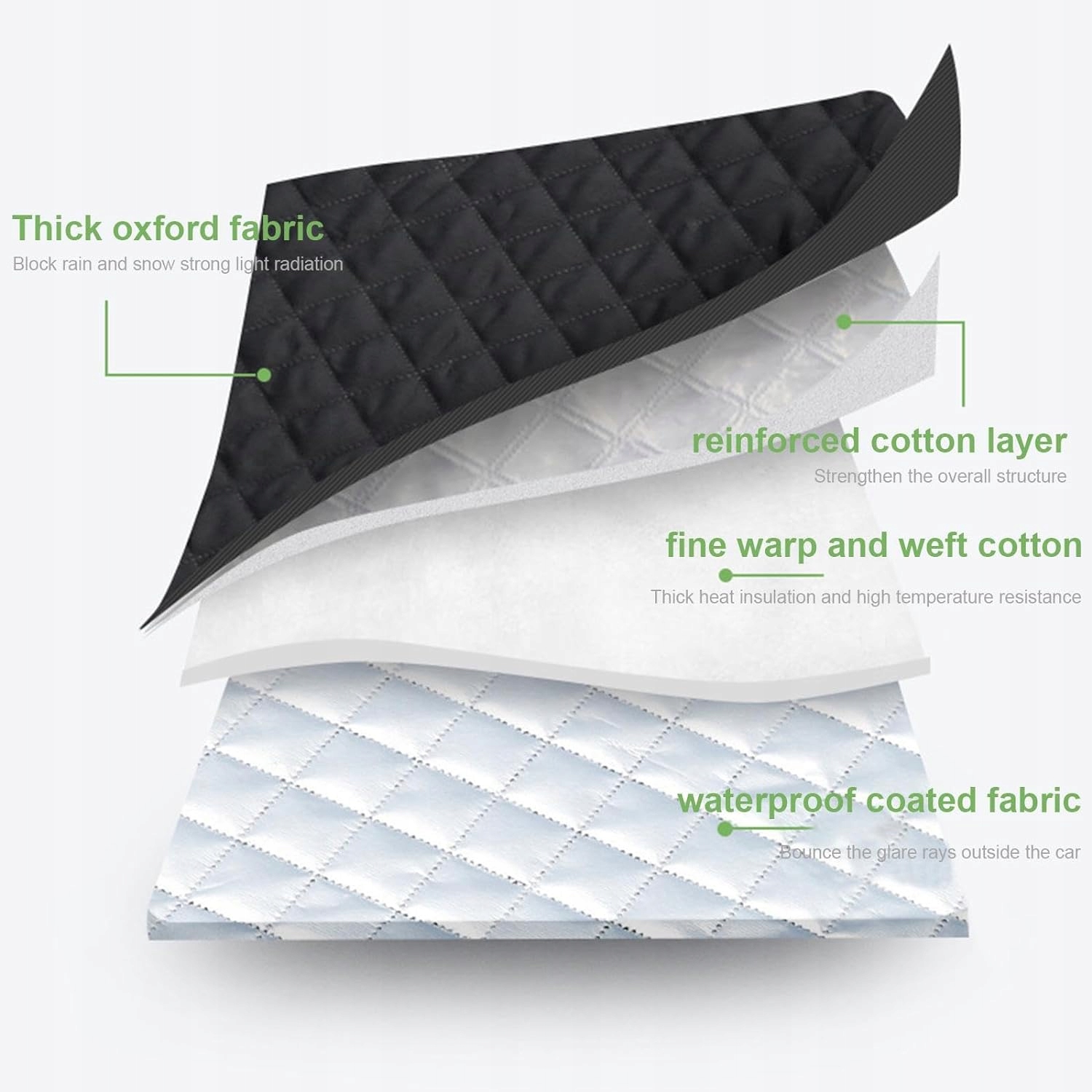 Універсальний дизайн, не дозволяйте поганій погоді зіпсувати ваш день, має багатофункціональний дизайн, який ефективно захищає лобове скло та дзеркало заднього виду від сонця, снігу та морозу. З легкістю повністю захищайте свій автомобіль. Багаторазовий матеріал Наш антифризний чохол для лобового скла виготовлений із водонепроникної снігової тканини з ПЕТ-поліефірного волокна, стійкої до води та суворих зимових умов. Міцна конструкція, яка легко миється, забезпечує чудовий захист від снігу, щоб захистити ваш автомобіль від морозу та бруду. Покращена функція безпеки з додаванням світловідбиваючих смужок і великих амбушюр, наш захист лобового скла автомобіля від замерзання забезпечує кращу видимість і безпеку вночі. Ці світловідбиваючі попередження роблять ваш автомобіль більш привабливим, забезпечуючи максимальну безпеку та видимість під час їзди вночі. Удосконалений снігозахисний щиток із нашим антифризним щитком для лобового скла автомобіля забезпечує кращий захист від снігу завдяки товстішій тканині Оксфорд. Отримайте ширшу зону покриття, довший термін служби та стійкість до подряпин для душевного спокою. Простий у використанні, захищайте свій автомобіль цілий рік за допомогою нашої цілорічної кришки для лобового скла. М'який композитний матеріал Oxford запобігає пошкодженню вікна автомобіля та ефективно перешкоджає налипанню снігового покриву.