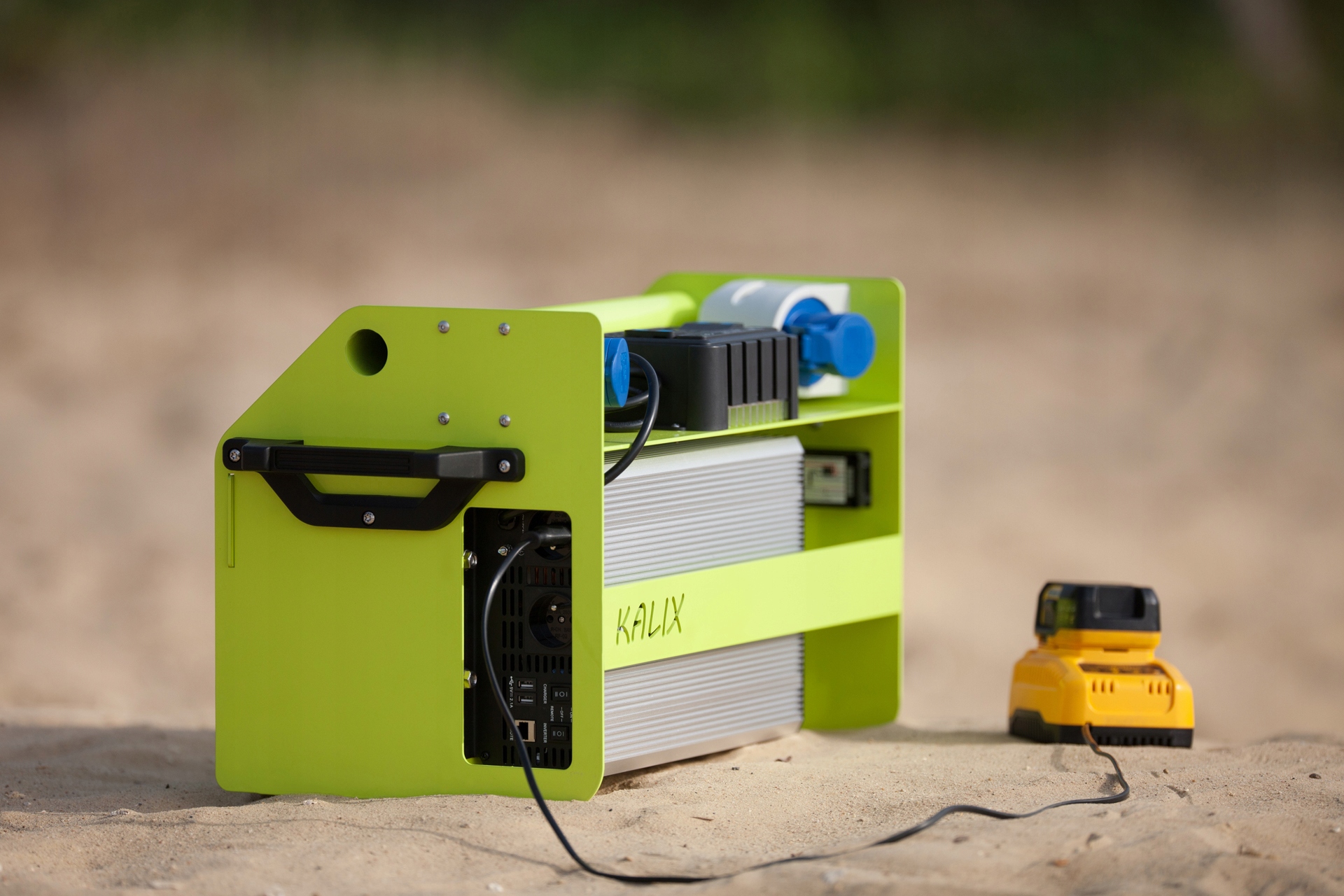 В комплект входить акумуляторний накопичувач енергії потужністю 1,9 кВтг з вбудованим інвертором потужністю 2 кВт і дві портативні сонячні панелі потужністю 200 Вт кожна з кабелем довжиною 5 м.це рішення дозволяє встановити панель в межах сонячного світла на певний час в будь-якому місці, поки генератор знаходиться всередині будівлі або транспортного засобу.