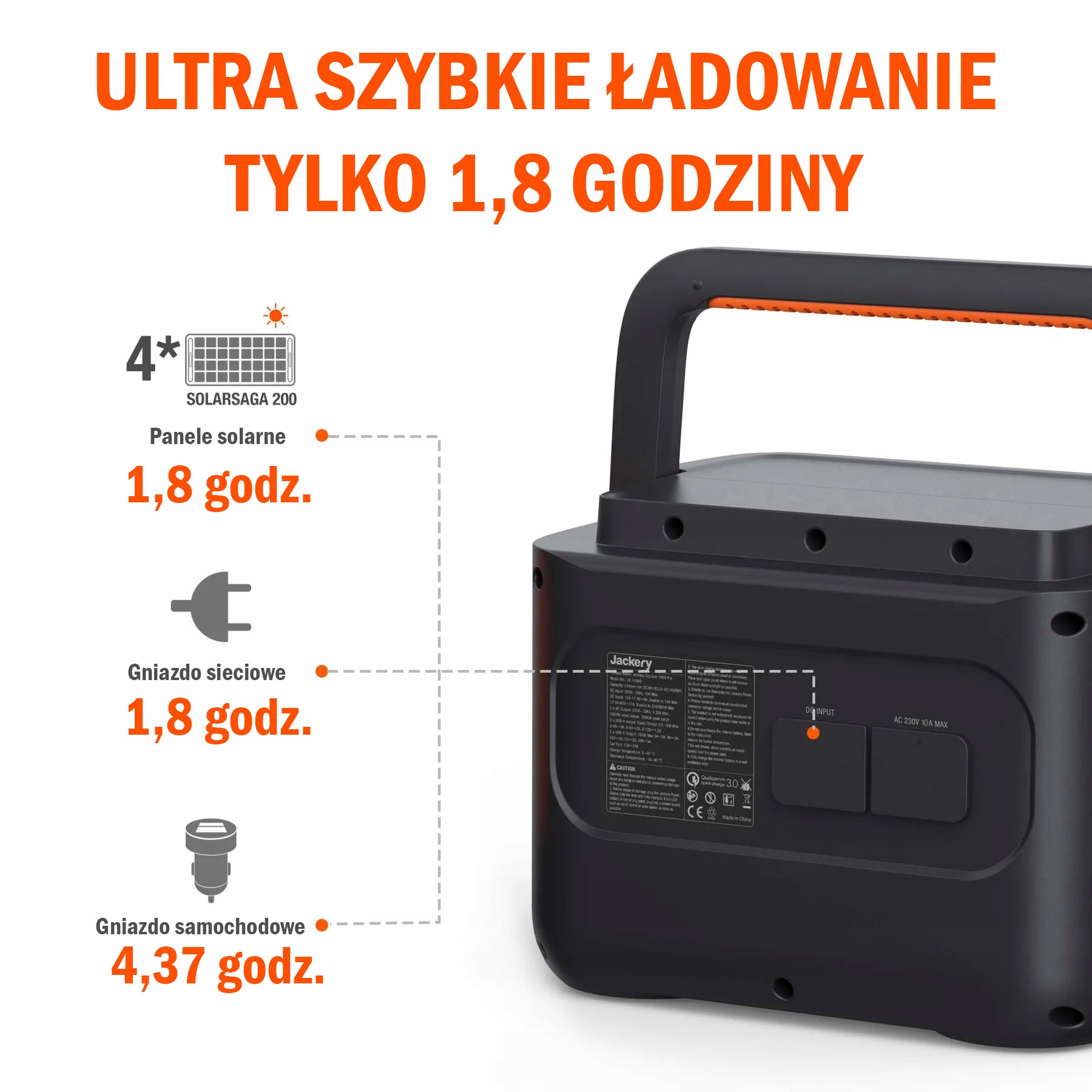 повна зарядка станції живлення протягом 1,8 годин можлива через розетку змінного струму 230 В або чотири сонячні панелі SolarSaga 200 Вт. низький рівень саморозряду забезпечує 365 днів в режимі очікування при рівні заряду батареї 80%.е>