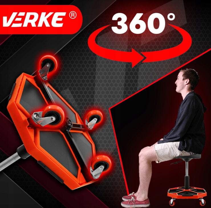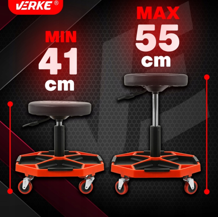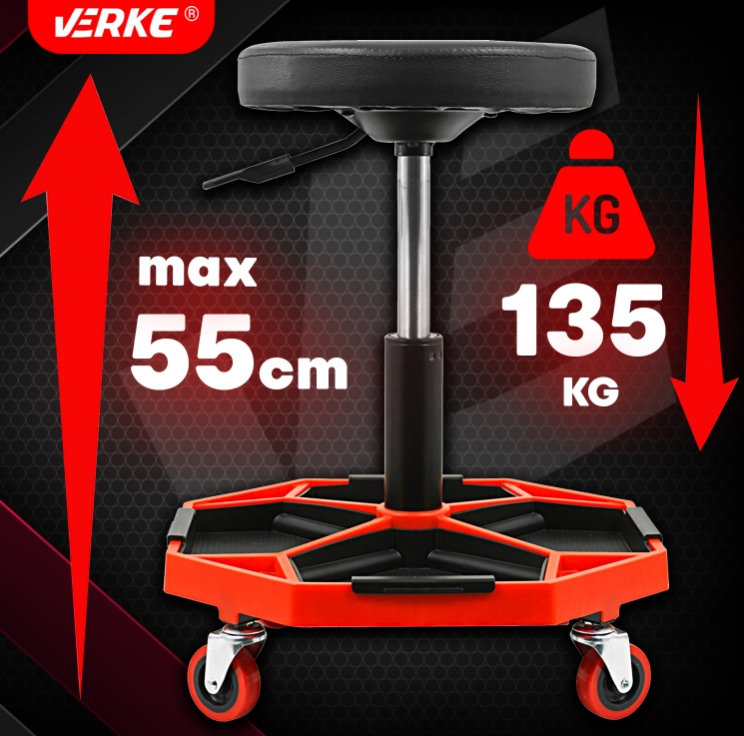Табурет від Verke призначений для використання в професійних майстернях, автосервісах, ремонтних майстернях, а також також чудово підходить для перевірки в домашньому гаражі. Має поворотне сидіння та 4 поворотні колеса, які підвищують його мобільність. Практичне рішення - обладнати його великою полицею, де механік зможе розмістити інструменти, які використовуються під час роботи. Покриття комфортного сидіння виконано з ПВХ. Завдяки пневматичному регулюванню висоти його легко підлаштувати під зріст людини.
