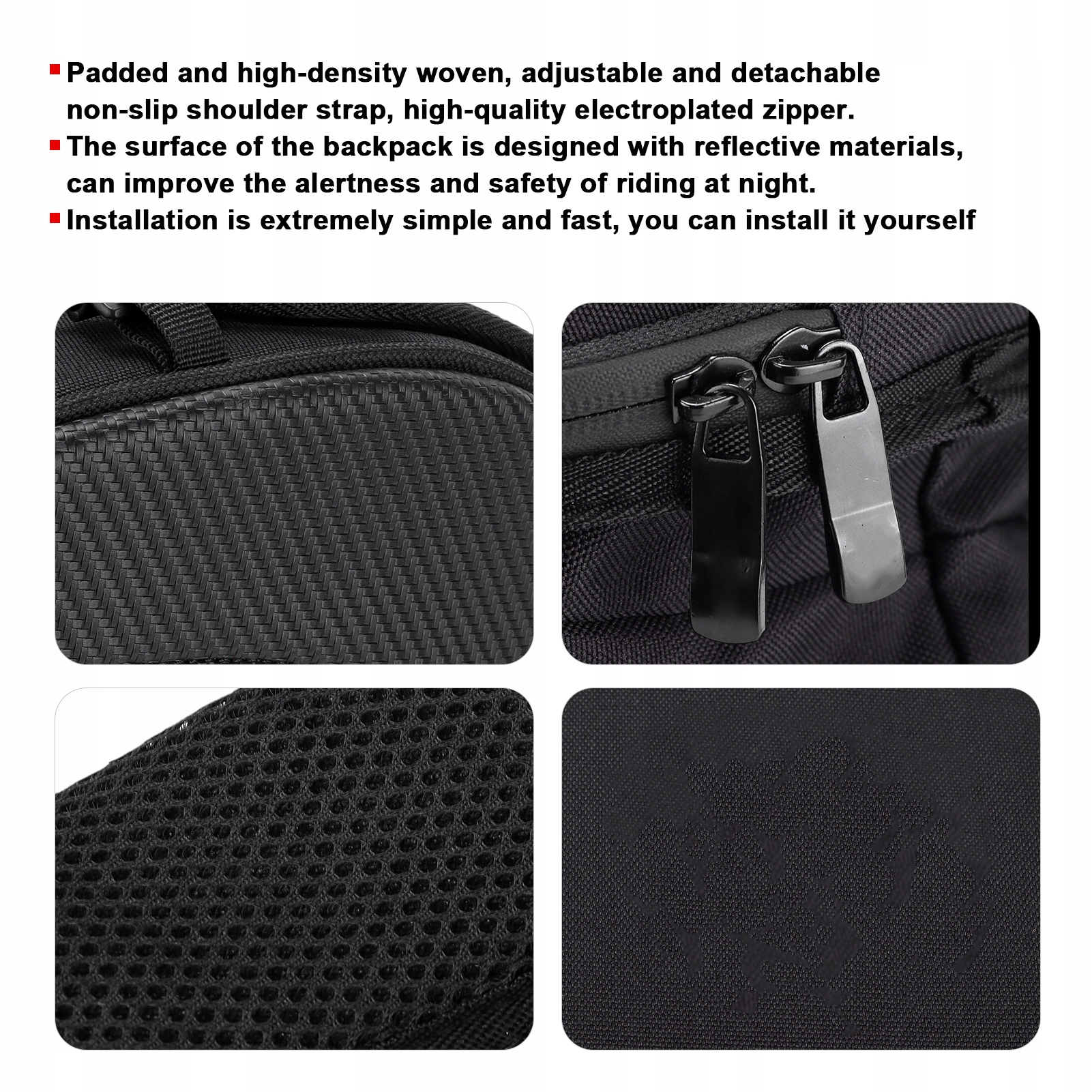 3. Поверхня рюкзака розроблена зі світловідбиваючими матеріалами, що може підвищити вашу пильність і безпеку під час водіння вночі.