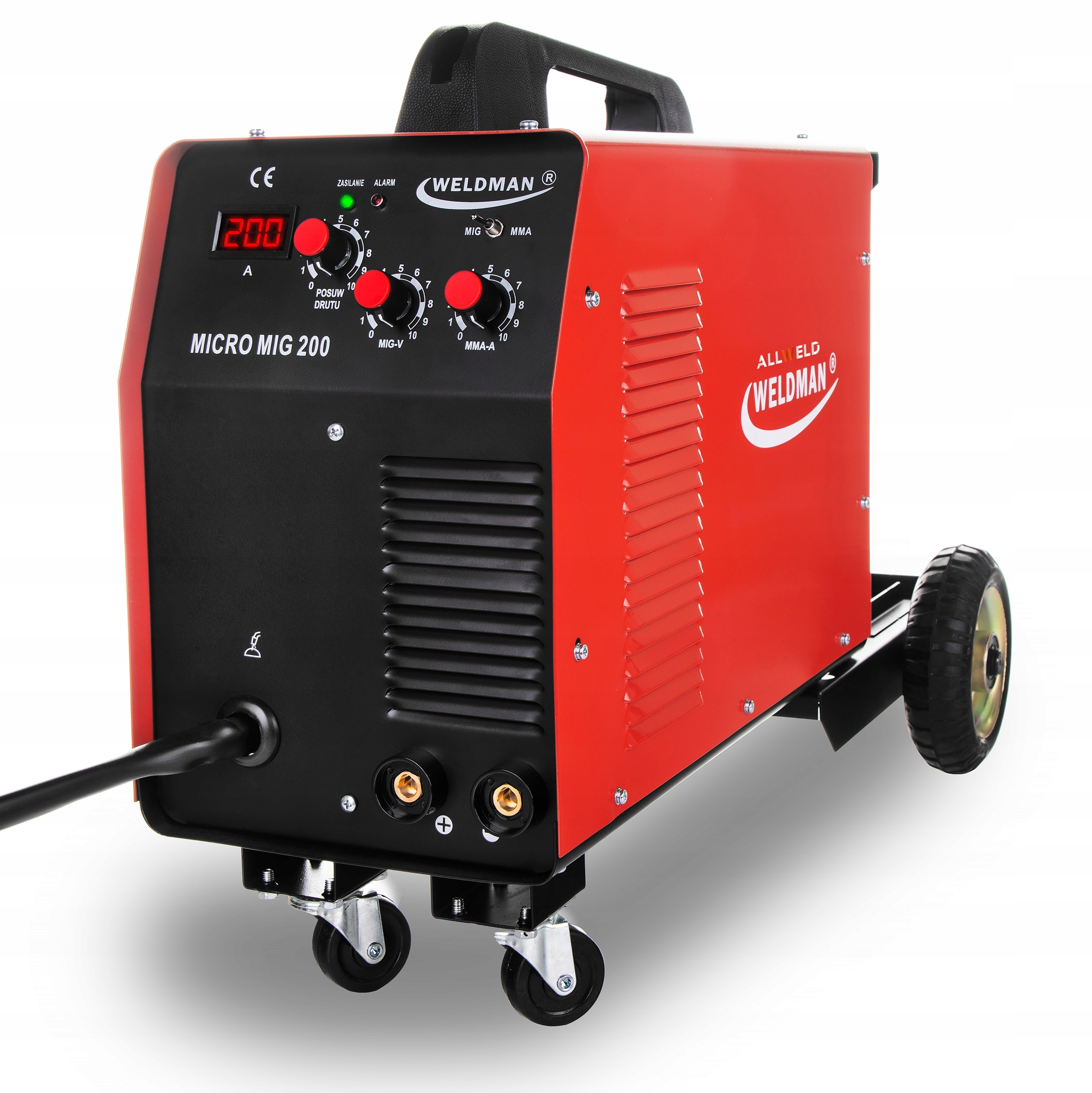 виробник: WELDMAN║ методи зварювання: MIG/MAG, MMA, FLUX ║ джерело живлення: 230V ║ зварювальний струм: 20-200 ║ ККД: 60%