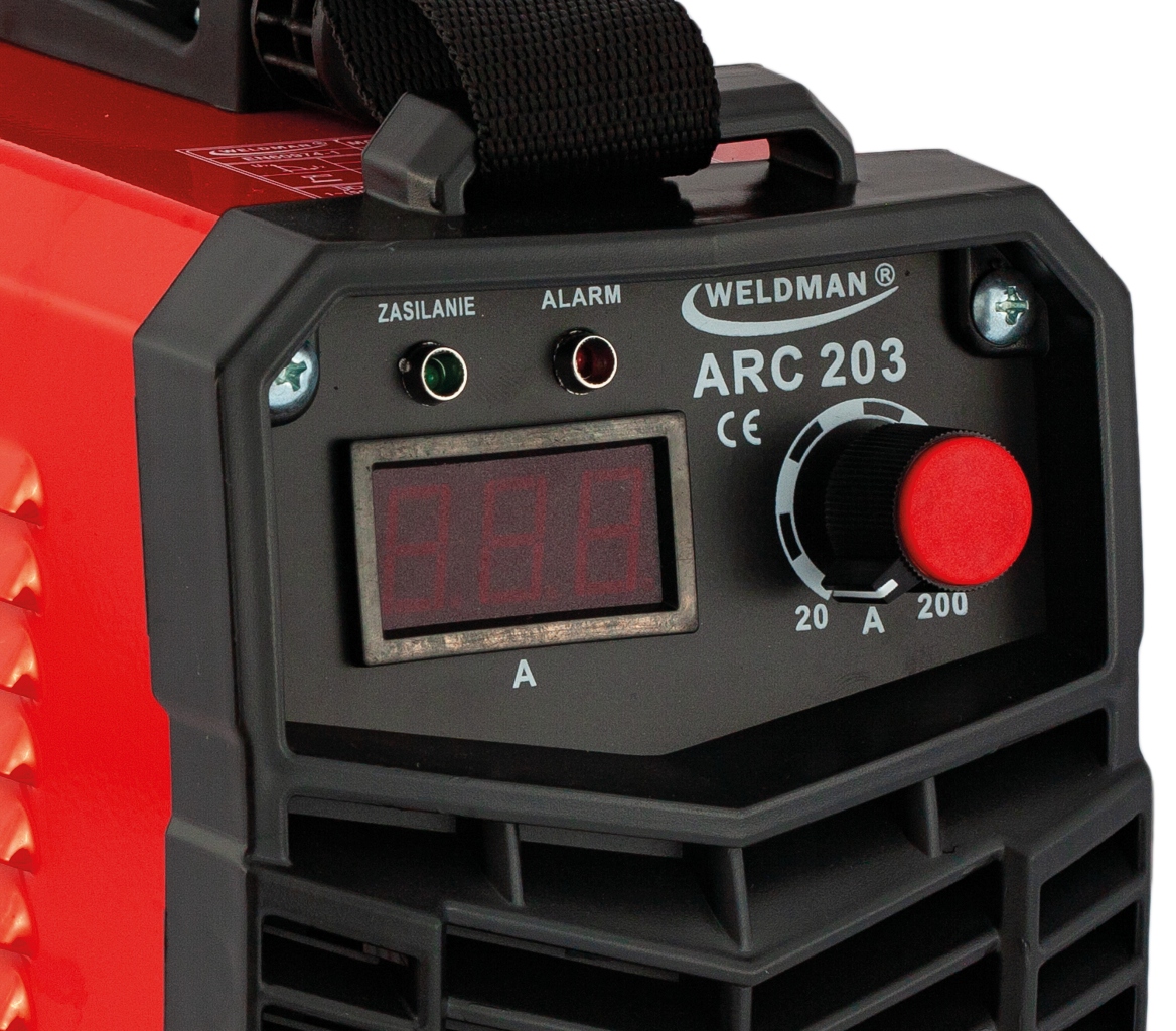 зварювальний апарат ARC 203 має цифровий дисплей зварювального струму, оснащений простою системою індикаторів. Світлодіоди на передній панелі інформують < /b > про підключення до джерела живлення (зелений світлодіод) або вимикання через перевантаження (червоний світлодіод). Під час роботи нам також стане в нагоді плавне регулювання зварювального струму з електронним управлінням і спеціальний захист обладнання від перевантаження.е>