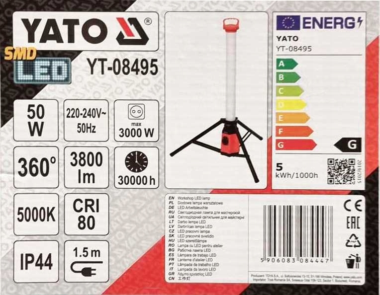 лампа зі складним штативом призначена для використання в приміщенні і на відкритому повітрі. Режим роботи 3800 лм забезпечує дуже хороше освітлення робочого простору у всіх напрямках. Додатковою перевагою є вбудована електрична розетка, до якої можна підключити обладнання з максимальною потужністю 3000 Вт.