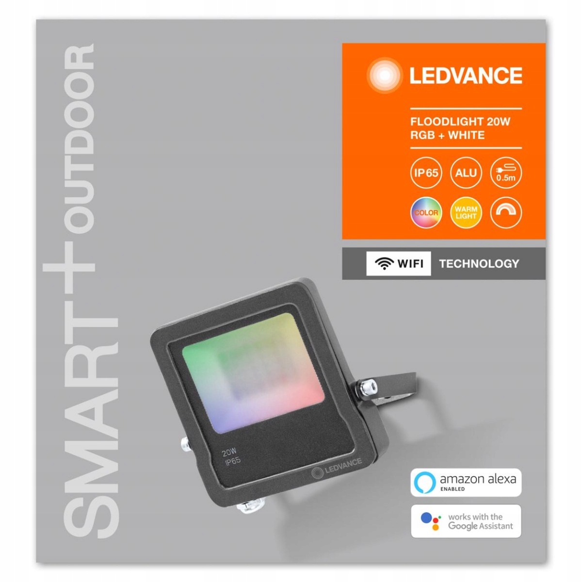Світлодіодний прожектор ledvance оснащений енергозберігаючим світлодіодним джерелом світла 2 0W , багатобарвний RGB+Вт з теплим кольором 3000K, що дозволяє отримати світловий потік 1260lm . Галогенні світлодіодні LEDVANCE-це інноваційний та інтелектуальний пристрій, який має своє зовнішнє застосування, найкраще підходить для освітлення садів, фасадів будівель. Управління прожектором здійснюється за допомогою мобільного додатку LEDVANCE SMART + , доступного для завантаження в магазині GOOGLE PLAY (Android 6.0 і вище) або App STORE (iOS 10 або старше), крім того, для голосового управління ми можемо використовувати Google Assistant або Amazon Alexa.е>