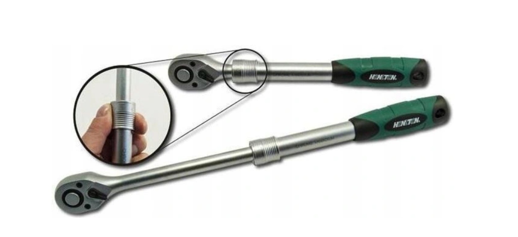 телескопічне брязкальце відомої фірми HONITON. Храповик виготовлений з хромованадіевой стали, що гарантує високу довговічність і надійність. Механізм подовжувача має храповий замок, який працює з біговою доріжкою з фіксуючими отворами на важелі храповика. Храповий механізм дуже точний: він має 72 зубця з робочим кроком 5 футів. Храповик має міцну ручку для підвищення комфорту роботи. Це просто збільшить крутний момент у багато разів. Храповик має високу міцність, що дозволяє працювати в умовах промислових навантажень.е>