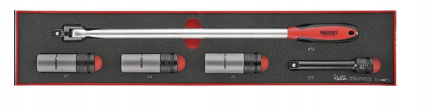 набір з 5 предметів, що складається з трьох насадок 1/2" для кріпильних болтів колеса, оснащених захисною пластиковою втулкою, а також шарнірною ручкою 1/2" і міцним подовжувачем 1/2 " довжиною 125 мм. Інструменти поміщаються в губчастий картридж EVA з трьома шарами різних кольорів. Контейнери підходять для ящиків і візків Teng Tools.