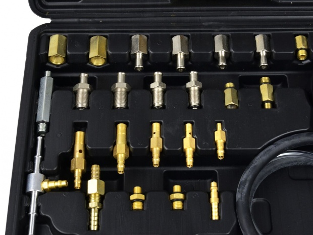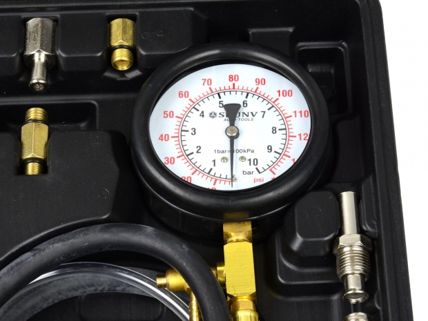 вимірювач тиску уприскування бензинової системи. У комплект входить легко читається манометр, а також комплект шлангів і з'єднувальних адаптерів. Тестер дозволяє вимірювати тиск форсунок в більшості автомобілів, доступних на європейському ринку.
