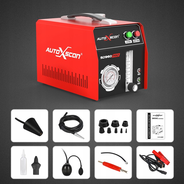 Професійний автоматичний прилад для перевірки герметичності труб, шлангів, з'єднувачів і інсталяцій за допомогою генератора диму. Це допоможе нам швидко й точно виявити витоки в системах трубопроводів за лічені хвилини. Можливість використання приладу для перевірки впускної системи, перевірки турбокомпресора, перевірки вихлопної системи, перевірки системи охолодження, перевірки герметичності автомобіля, перевірки системи паливного бака, перевірки різних трубопровідних фітингів.