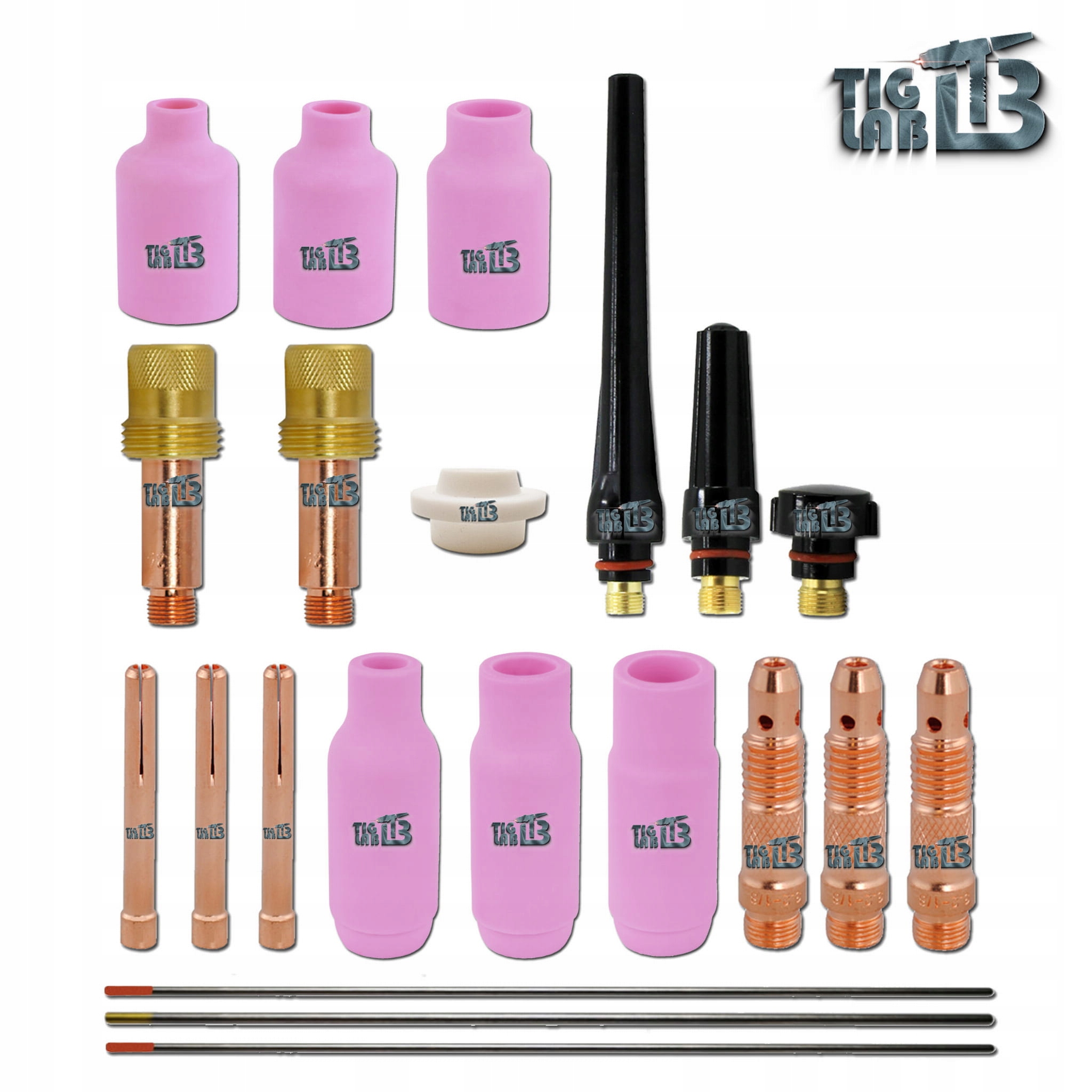 разом з придбаним зварювальним пальником TIG ми отримуємо набір витратних деталей, призначених для зварювання нержавіючої сталі та алюмінію: