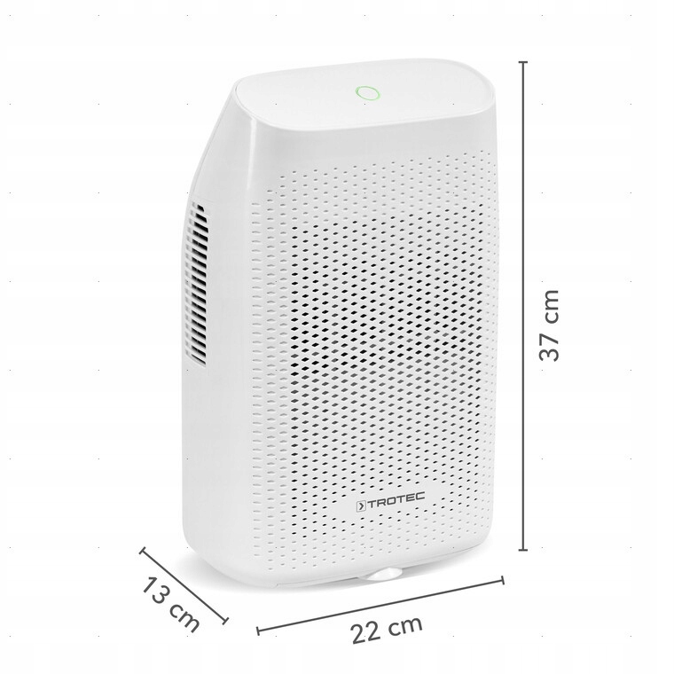 осушувач повітря Trotec TTP 10 E-це компактний осушувач для невеликих приміщень, таких як спальні, гардеробні, ванні кімнати без вікон, Комори, комори і книжкові полиці. Він забезпечує уловлювання надлишкової вологи з повітря, зменшує кількість конденсату і запобігає утворенню цвілі. Цей осушувач повітря з системою Пельтьє споживає дуже невелику кількість електроенергії і через свого принципу роботи не вимагає системи розморожування. Крім того, пристрій не створює шуму під час роботи, тому не порушує сон. Осушувач повітря Trotec TTP 10 E забезпечує ефективність осушення до 750 мл в день і може працювати при температурі від 10 до 50 ° C.< / п>