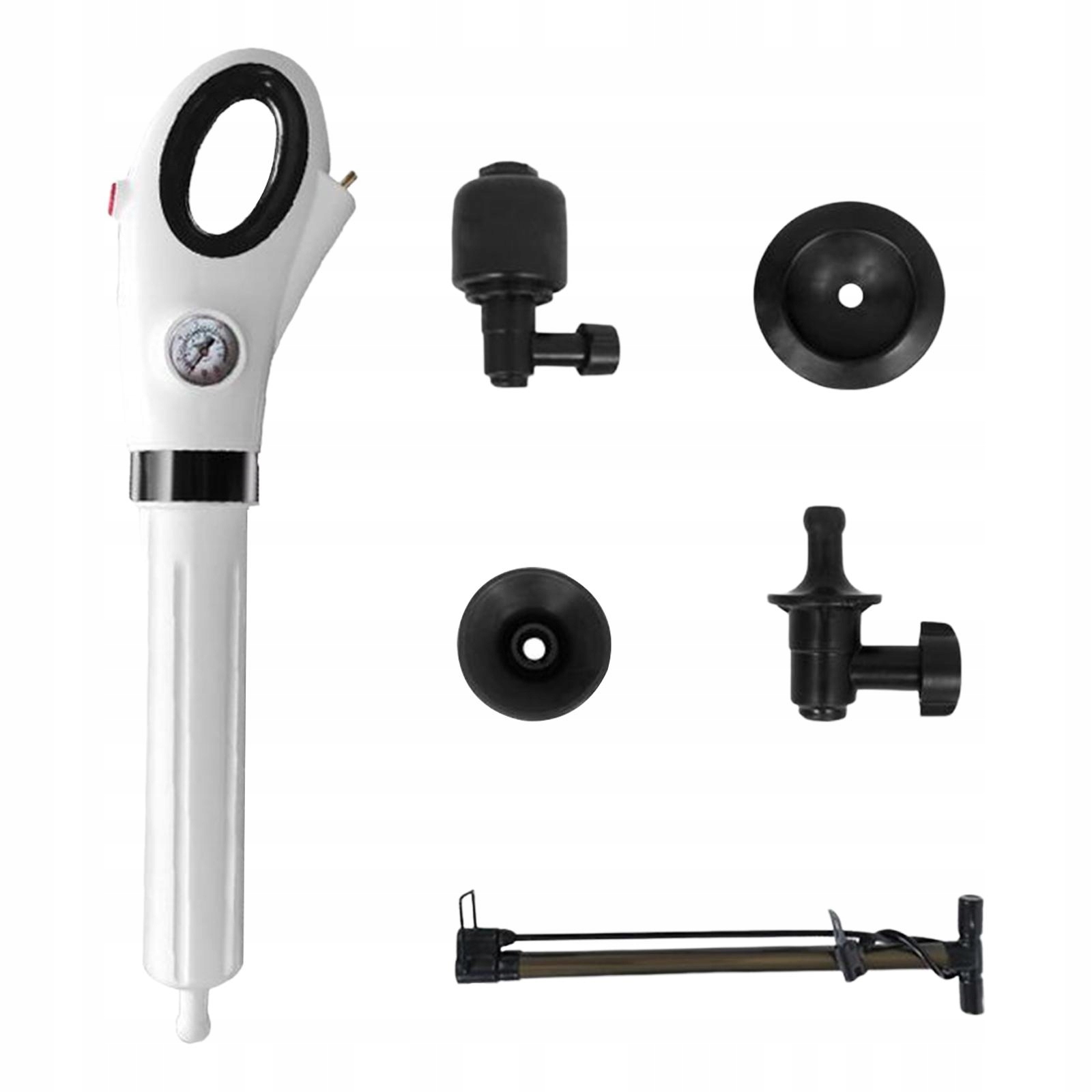 4 головки: з 1 головкою перетворювача + 3 змінними поршневими головками, які є головкою унітазу, головкою раковини/каналізаційної високого тиску, який може накачувати велосипеди, баскетбольні м'ячі