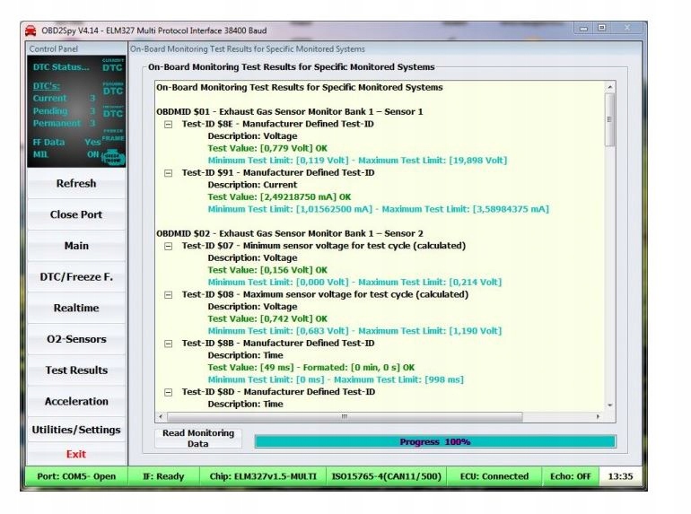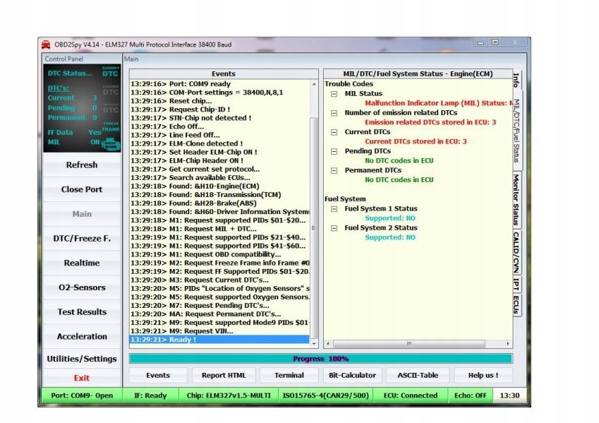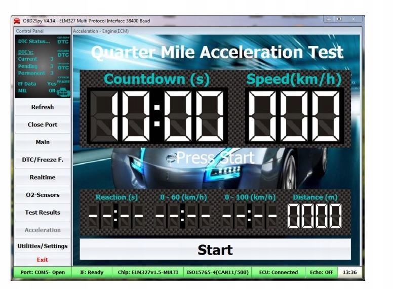 зчитування зареєстрованих кодів помилок, які викликали ввімкнення індикатора CHECK ENGINE: вимірювання двигуна потужність (HP) очищення індикатора CHECK ENGINE читання та видалення помилок OBD II - усі протоколи читання та видалення очікуваних помилок (якщо індикатор не вимірювання таких параметрів, як прискорення від 0 до 100 км/год читання загальних помилок і помилок виробника перевірка значення коди помилок моніторинг параметрів роботи двигуна в реальному часі (Live Data) постійне читання параметрів (онлайн) попередній перегляд заморожених кадрів (Freeze Frames ) У темі галереї є зразки знімків екрана з безкоштовних програм, що підтримують ELM 327.