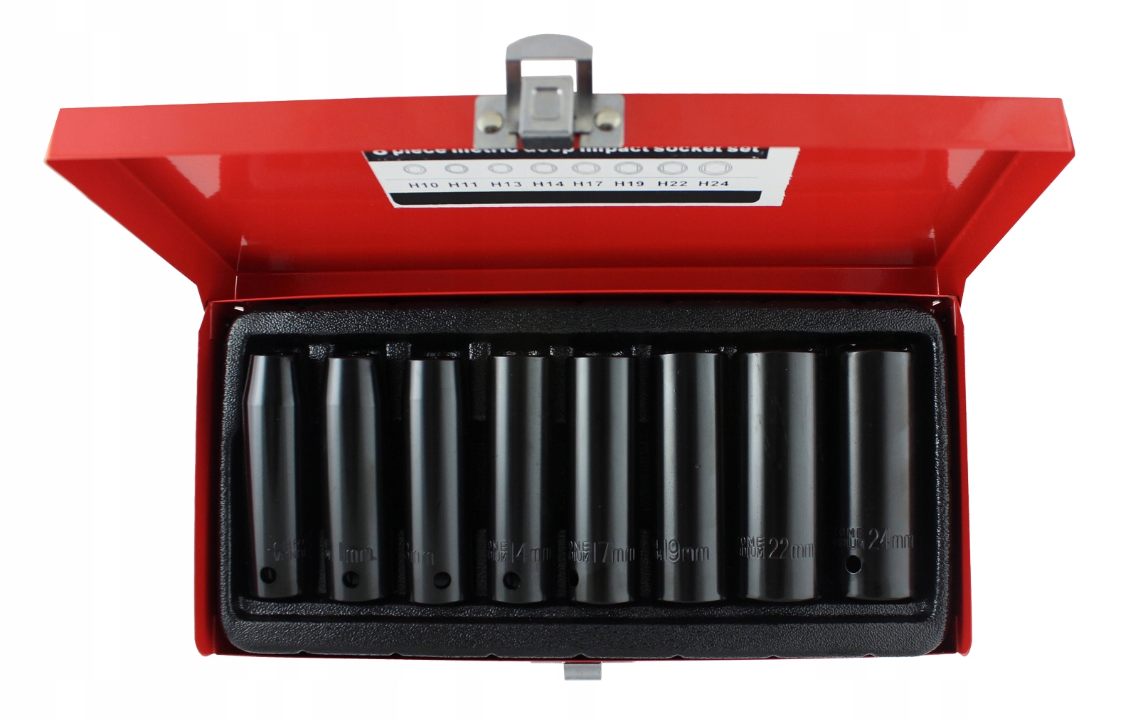 набір ударних насадок з шестигранною головкою довжиною 78 мм для оправлення 1/2" заглушки мають захист від небажаного зісковзування оправлення з гнізда. Довгі ковпачки забезпечують доступ до глибоких гвинтових гнізд. Виготовлений з міцної хром-ванадієвої сталі. Поставляється в практичній металевій касеті для зберігання.е>