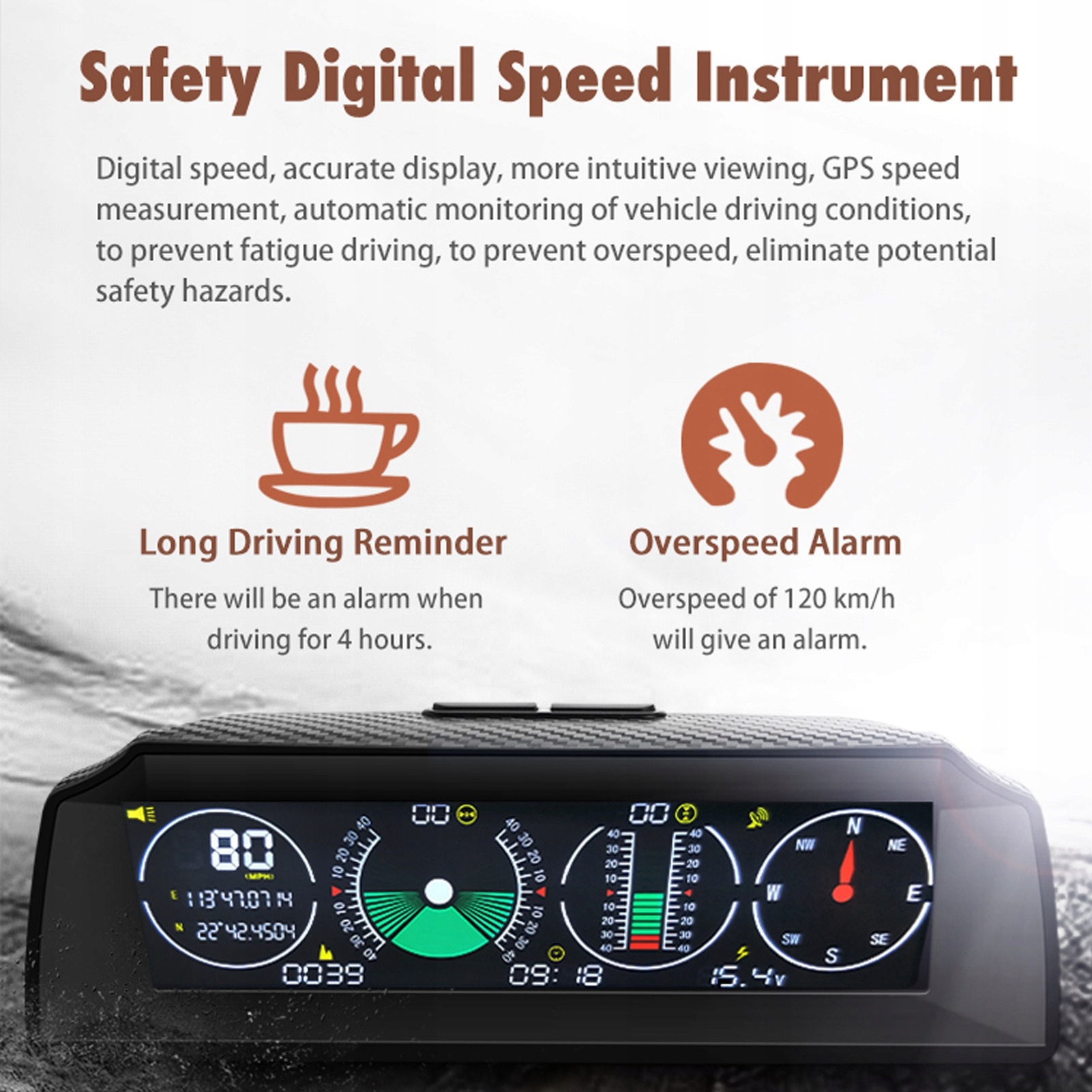 1. Багатофункціональний: GPS супутникова швидкість транспортного засобу, Функція відображення вимірювання висоти, Функція відображення вимірювання широти і довготи, відображення компаса, відображення супутникового часу, функція сигналізації швидкості.