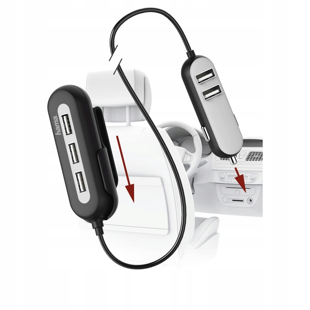 зарядка 5 устройств одновременно зарядная станция имеет 5 USB-входов, позволяющих удобно заряжать несколько устройств одновременно, что завершает эру „времени использования зарядного устройства” для каждого пассажира. Два слота остаются спереди, а концентратор с тремя дополнительными USB-входами можно разместить в задней части автомобиля, что позволяет использовать длинный 2-метровый кабель.п>