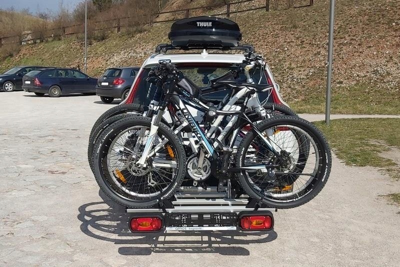 міцна І проста в установці велосипедна стійка для буксирувального гака, яка дозволяє перевозити 4 велосипеда.е>