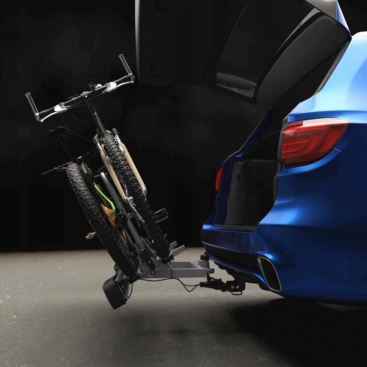 функція нахилу платформи вниз разом з велосипедами забезпечує можливість відкриття багажника автомобіля без необхідності знімати велосипеди для більшості автомобілів