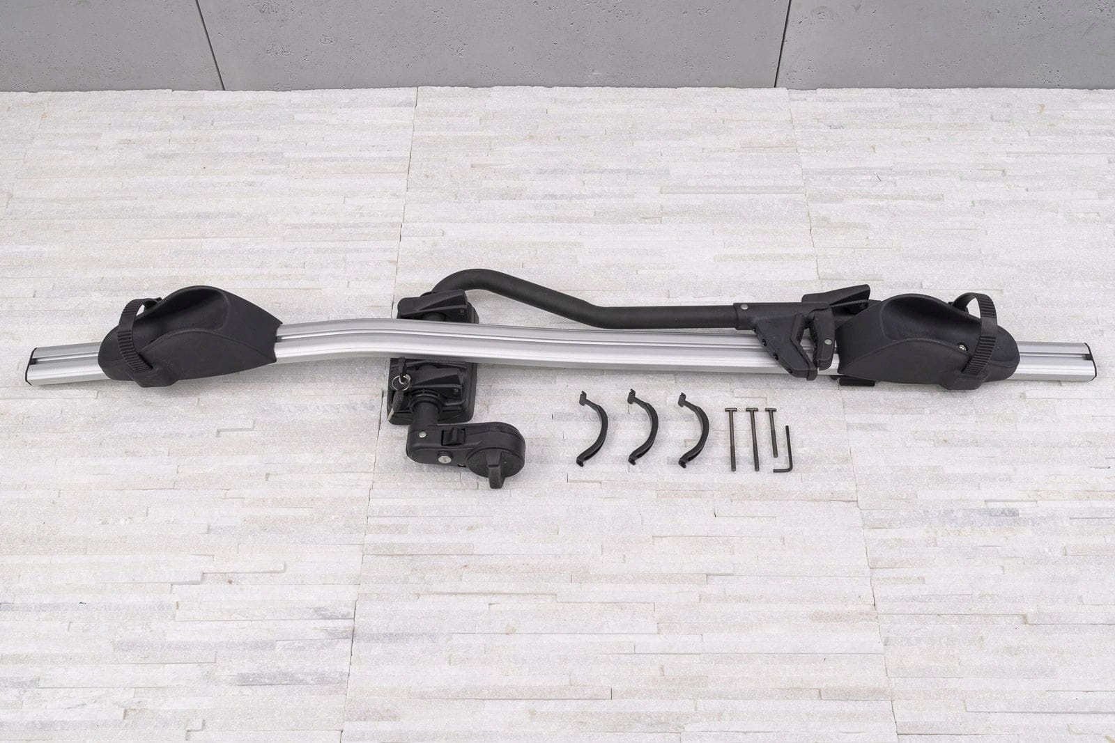 <е> велосипедна стійка сріблястого кольору, встановлена на даху автомобіля, сумісна з балками даху, призначеними для установки в системі "t". е>багажник відрізняється естетичним виконанням і високою функціональністю. Завдяки унікальному дизайну багажник дозволяє велосипеду автоматично позиціонуватися, коли він прикріплений-це конструкція, завдяки якій велосипед"вибудовується"самостійно. е>