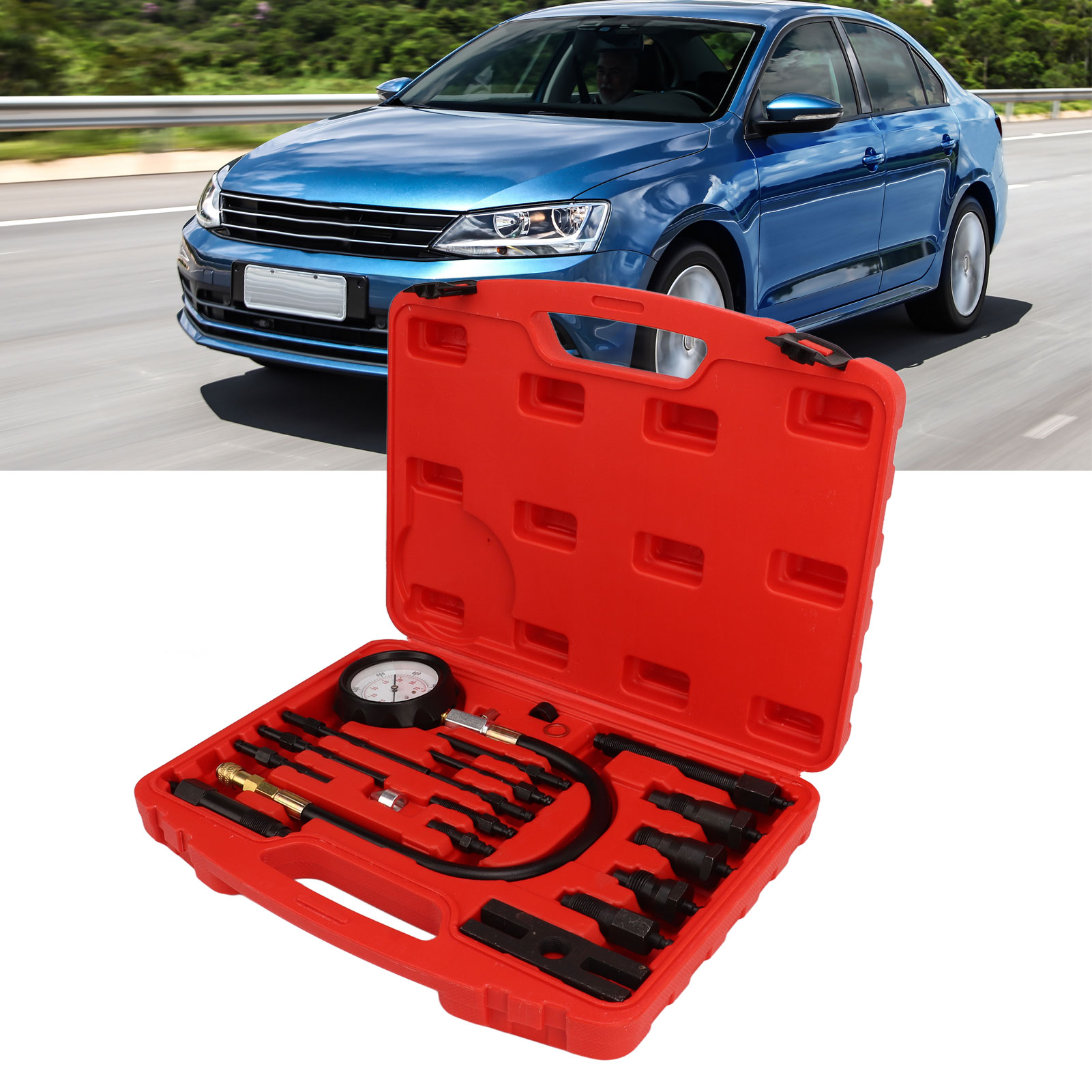 1000 фунтів на квадратний дюйм. 2. Універсальне застосування: комплект тестера стиснення двигуна підходить для широкого спектру автомобілів, мотоциклів та інших транспортних засобів, оснащених уприскуванням палива. 3. Потужна функція: комплект тестера стиснення призначений для виявлення різних поширених несправностей двигуна, таких як зношені поршневі Кільця, зношені клапани, перегорілі прокладки головки блоку циліндрів і тріщини головки блоку циліндрів. 4. Ефективна робота: точне виробництво, комплект тестера стиснення двигуна використовується для швидкого і точного вимірювання тиску в циліндрі двигуна. 5. Портативна коробка: всі інструменти добре організовані в формувальному корпусі для захисту компонентів, компактні, легкі, портативні і можуть мінімізувати безлад.е>
