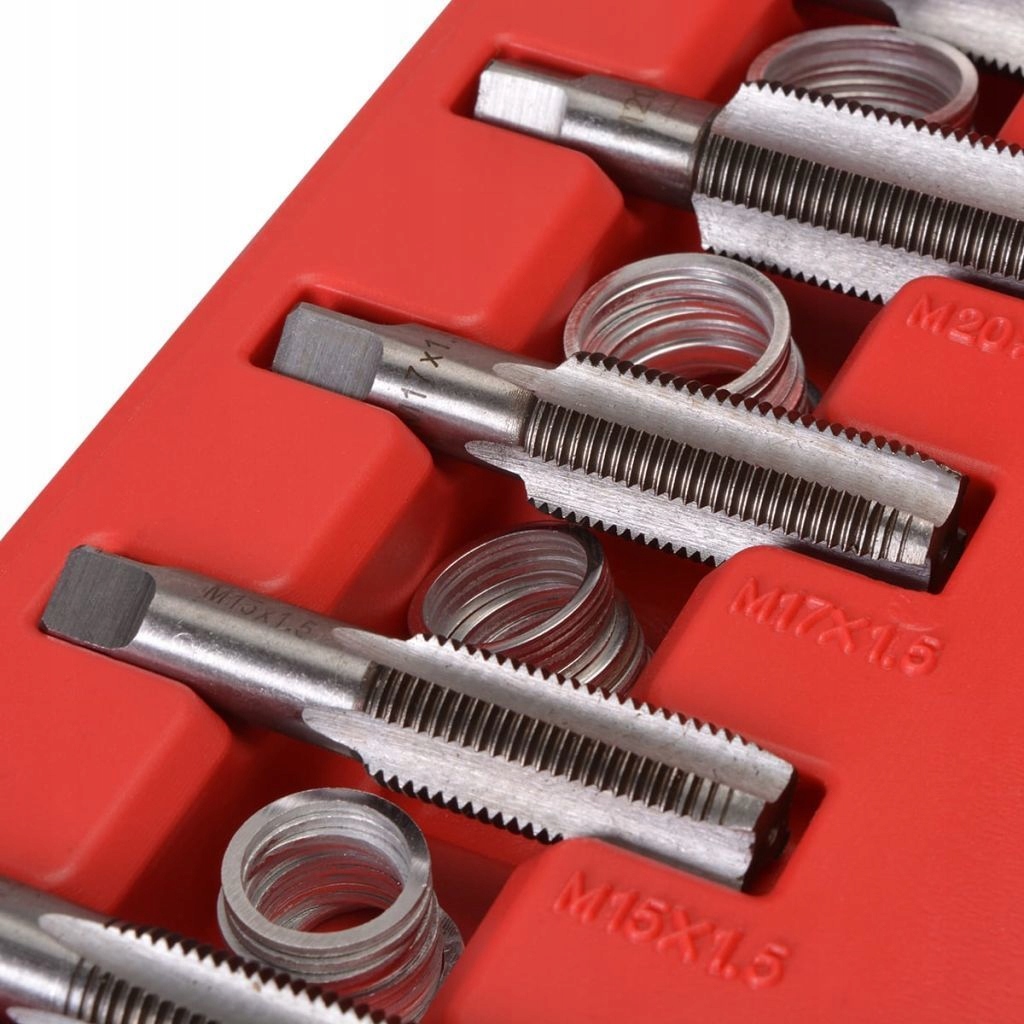 цей комплект надає нові збільшені Мітчики і замінники пробок для використання при пошкодженні або зносі існуючих ниток. Підходить для більшості ниток, що використовуються в автомобілях і легких комерційних транспортних засобах, таких як Audi, VW, BMW, Citroen, Fiat, Ford, Seat, Honda, Mazda, Mitsubishi, Opel, Peugeot, Renault, Toyota і Volvo.е>