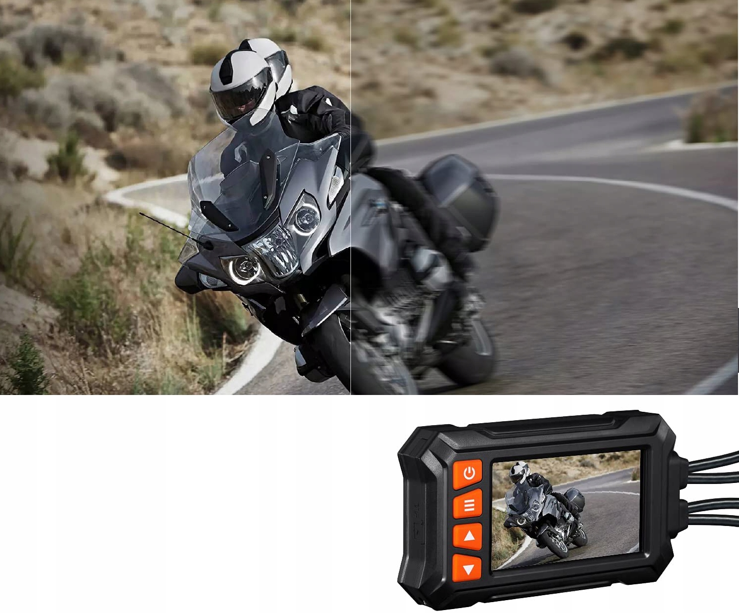 У комплект входять всі компоненти, необхідні для підключення безпосередньо до живлення мотоцикла і до вимикача запалювання.При включенні відео рекордер починає запис в циклі. Пристрій має можливість вибору довжини записуваних петель. Реєстратор оснащений G-сенсором, завдяки якому в разі зіткнення або аварії реєстратор автоматично захищає запис і блокує її від перезапису.