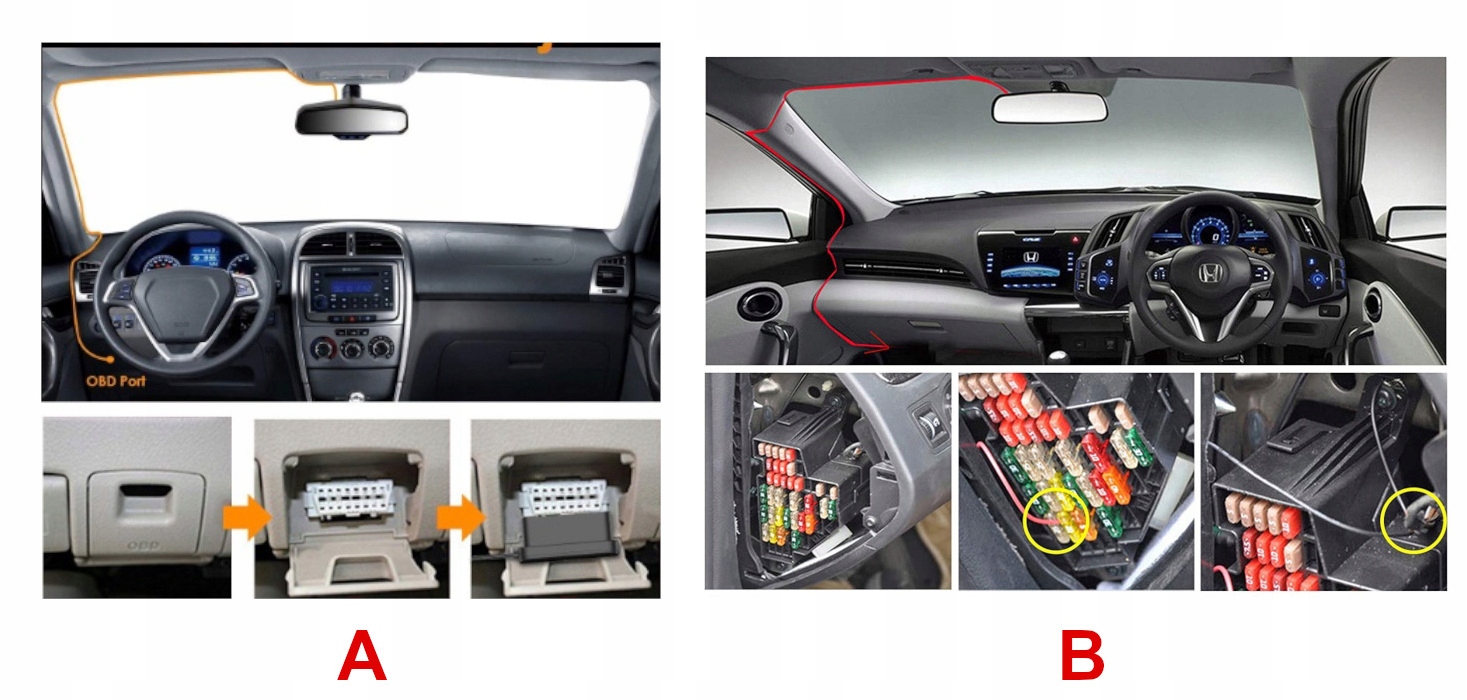 Як встановити реєстратор Vantrue за допомогою адаптера OBD? Подивіться, як це просто на схемі нижче! Підключіть кабель до камери з одного боку та до гнізда OBD в автомобілі з іншого, і все готово.