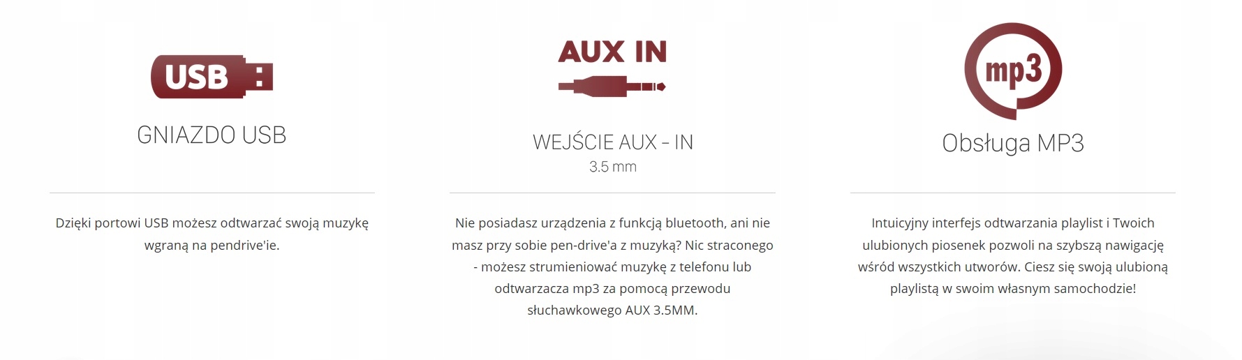 функції: меню польською мовою, можливість зміни шпалер, перегляд фото, відеоплеєр, можливість зарядки телефону, автоматичне перемикання на вигляд камери заднього виду, регулювання яскравості дисплея