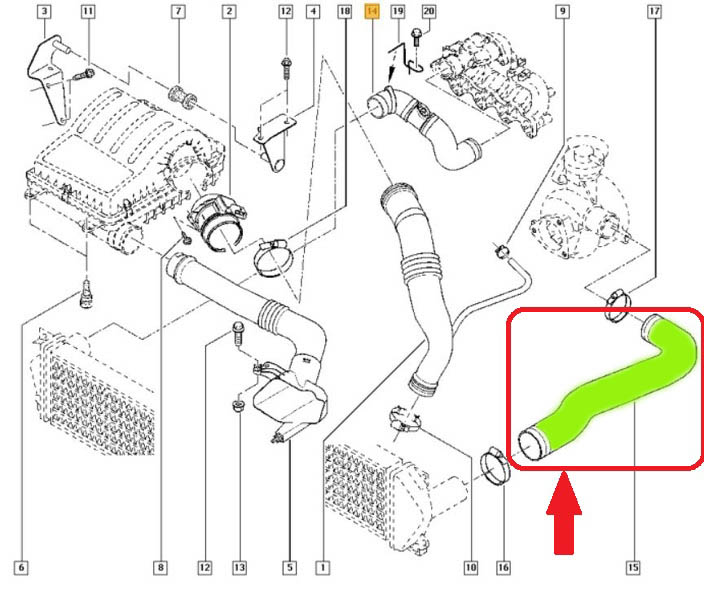 провід з'єднується між інтеркулером і турбонагнітачем зліва (Сторона водія).