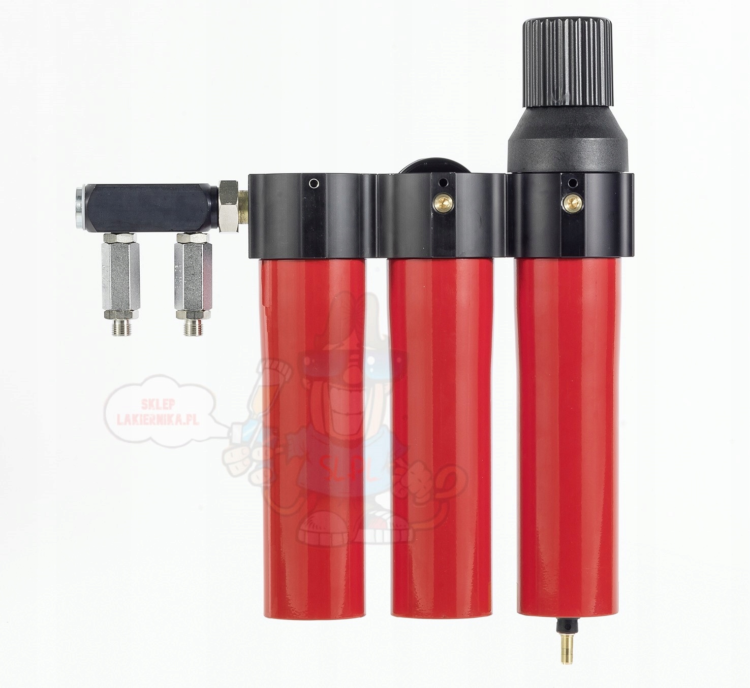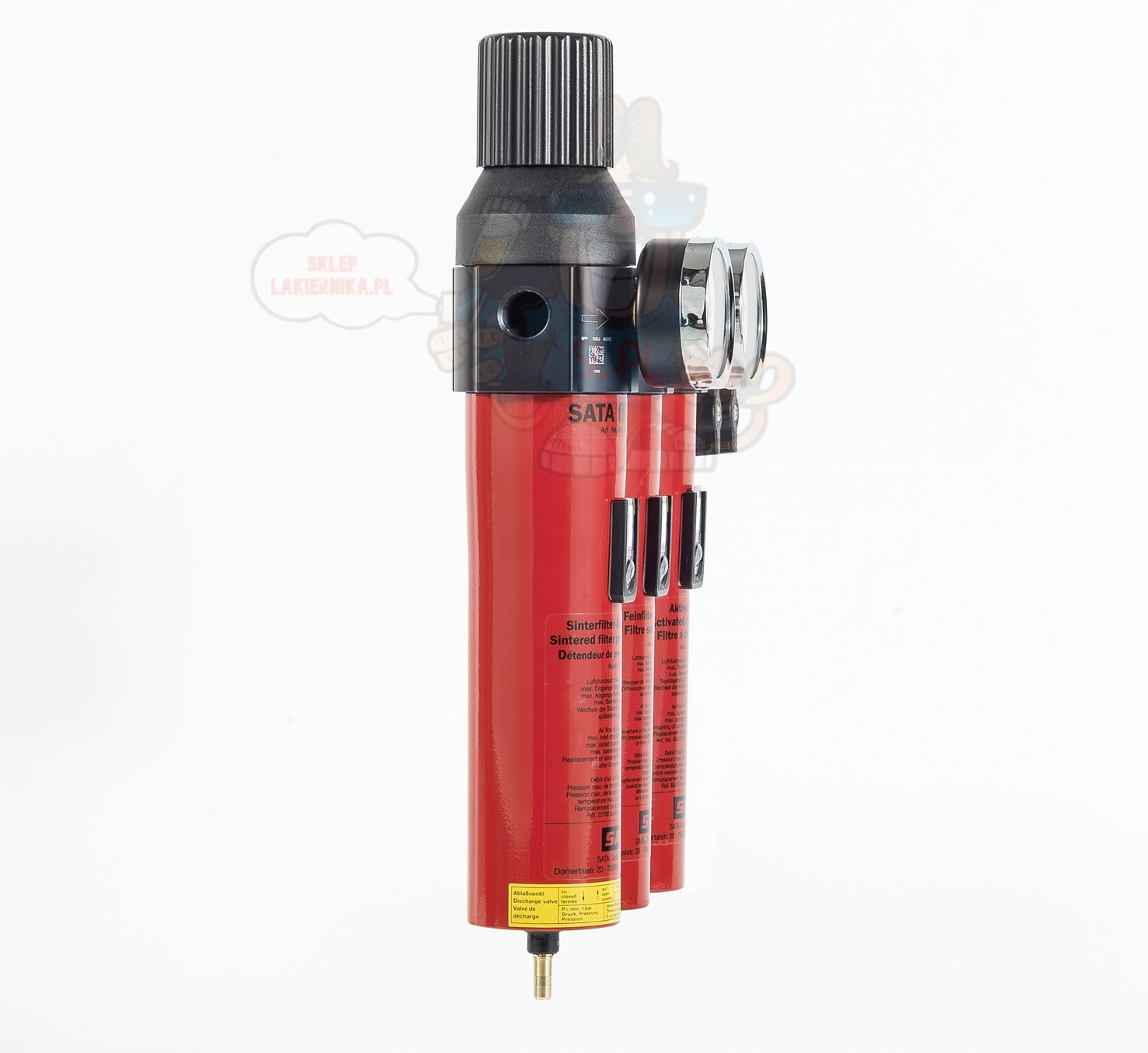 SATA Filter 484 триступеневий, з корпусом із спеченої бронзи, тонким фільтром, вугільним фільтром і регулятором тиску, з подвійним модулем з’єднання (2 x G 1/4 a) № кіт. 92320.