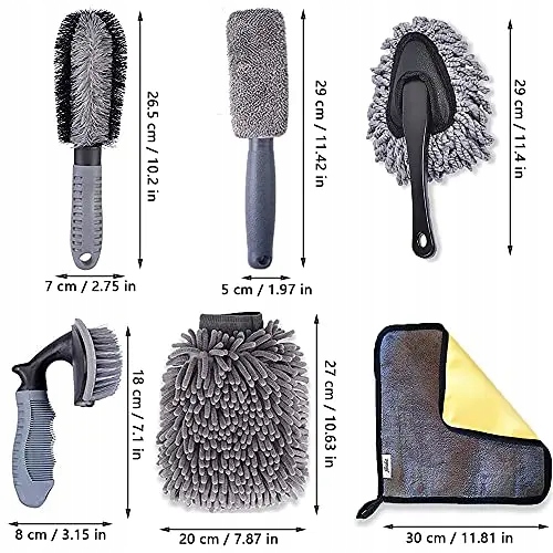 * обсяг поставки: 6 частин в одному наборі. 1 x Автомобільна/Автомобільна щітка для коліс, 1 x щітка з мікрофібри, 1 x щітка для обода з мікрофібри, 1 x щітка для автомобільних шин, 1 x Автомобільна щітка для пилу, 1 x тканина з мікрофібри