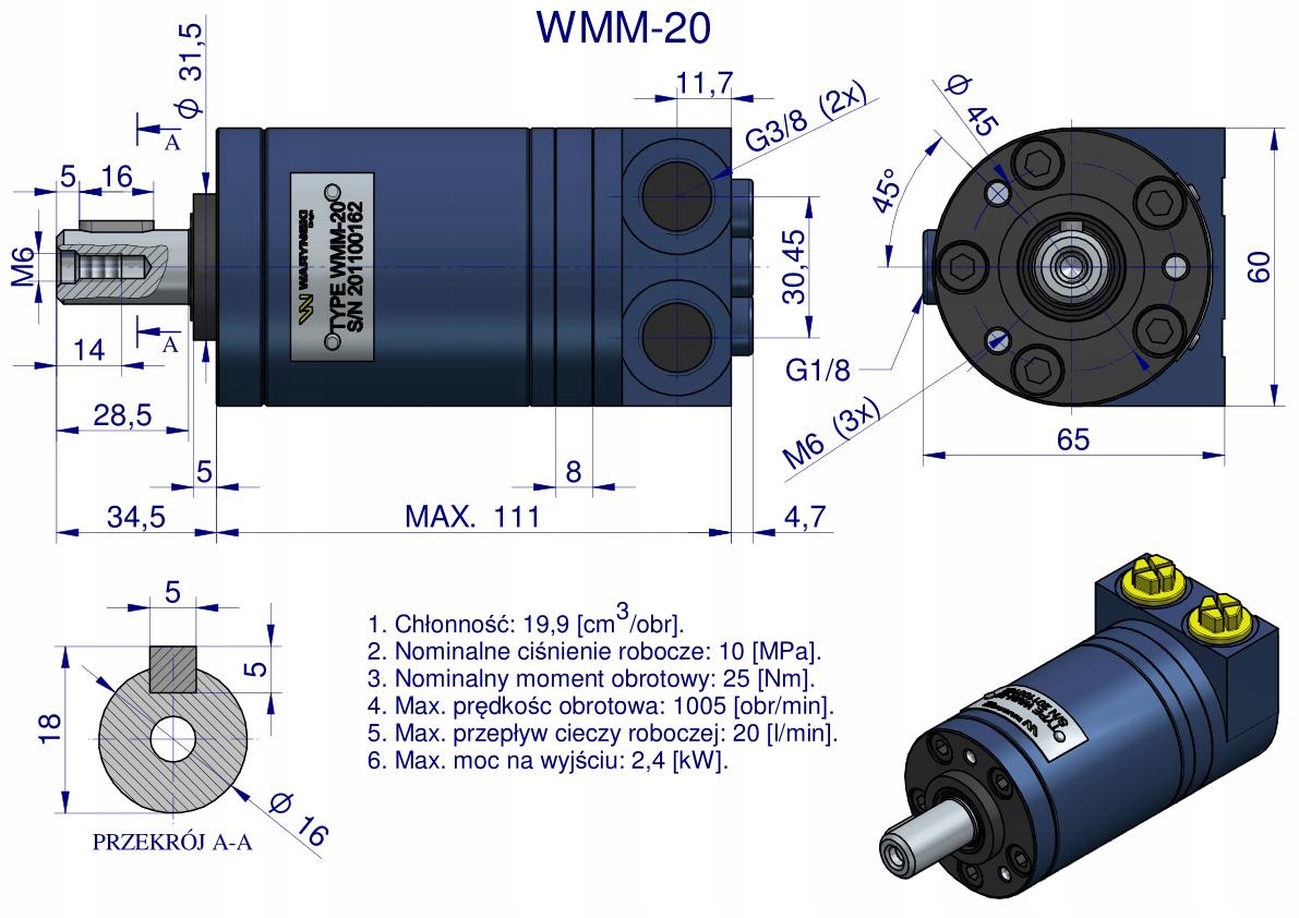 Орбітальний гідравлічний двигун WMM 20 см³/об (100 бар / макс. 140 бар / макс. миттєвий тиск 200 бар) Waryński. Двигуни серії WMM (бічне підключення) мають легку, компактну конструкцію, високий крутний момент. Можна з'єднувати паралельно або послідовно. Для досягнення більшого терміну служби рекомендовано, щоб оптимальні умови експлуатації були на рівні від 1/3 до 2/3 максимальних параметрів. Двигуни серії WMM належать до серії малих орбітальних двигунів.