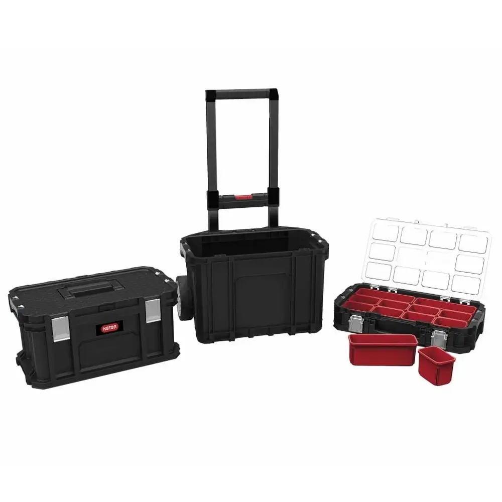 набір ящиків Connect Rolling System Keter професійна система зберігання інструментів KETER Connect Rolling System 3 шт.Набір мобільних ящиків, що дозволяє легко організувати і транспортувати інструменти-ідеальне рішення як для професіоналів, що працюють на місцях, так і для власників майстерень на задньому дворі. Набір дозволяє довільну конфігурацію елементів відповідно до індивідуальних потреб. Основні переваги: * дуже міцний і міцний матеріал, що гарантує довговічність конструкції і стійкість до механічних пошкоджень * велика ємність, що дозволяє легко транспортувати необхідні інструменти * металеві засувки і висувна телескопічна ручка * колеса, призначені для їзди по будь-якій поверхні