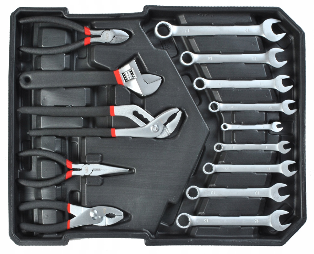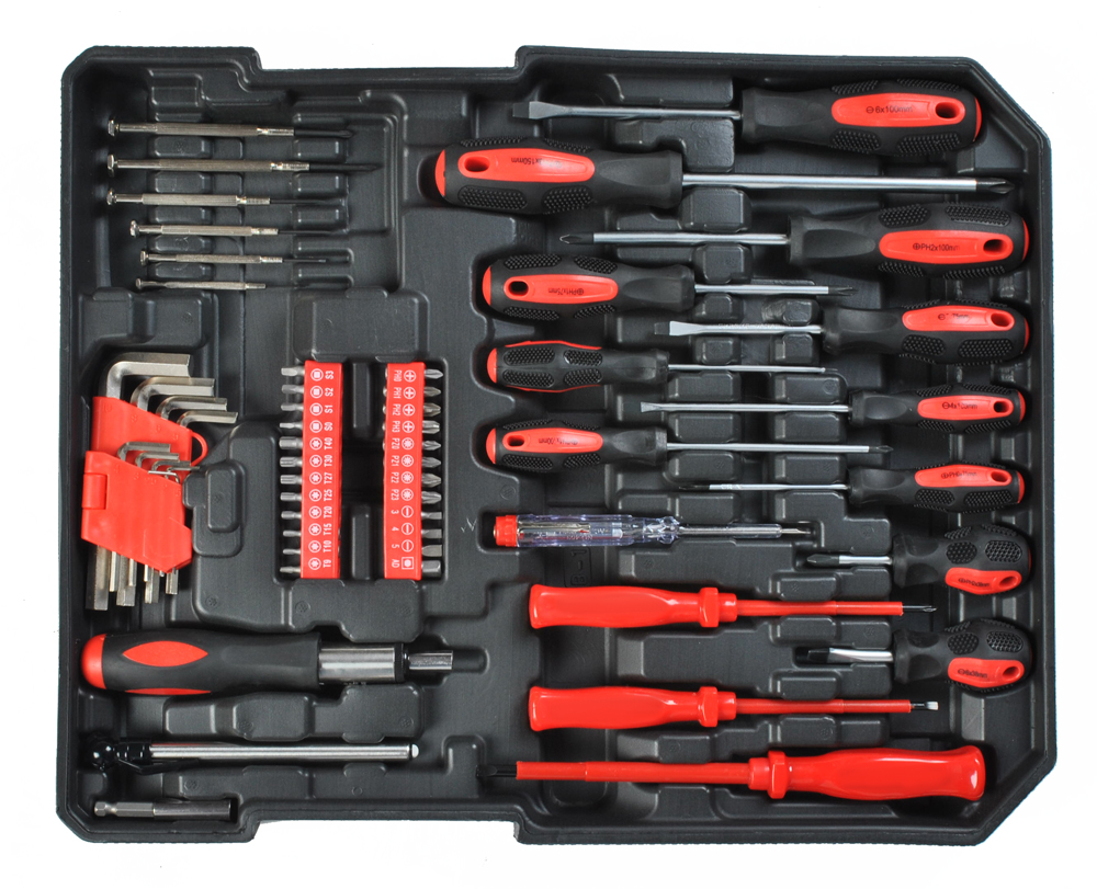 Професійний набір інструментів, який був розроблений з урахуванням потреб спеціалізованих автосервісів і механіків. Торцеві Ключі, а також привід торцевих головок були виготовлені з міцної інструментальної хромованадіевой стали CrV 50bv3. Ковпачки виготовляли методом штампування і перед процесом загартування калібрували за допомогою прецизійних вимірювальних приладів та контрольних приладів. Комплект дозволяє виконувати роботу, що вимагає дуже великих навантажень і точності, дозволяє виконувати безліч сервісних заходів, пов'язаних з відгвинчуванням і загвинчуванням різьбових з'єднань різних номінальних розмірів. Храповик має трикомпонентну рукоятку і 72 зубця (робочий хід 5 градусів).Інші інструменти виготовлені з високоякісних матеріалів гайкові ключі, торцеві ключі, викрутки, прецизійні викрутки і багато інших інструментів.е>
