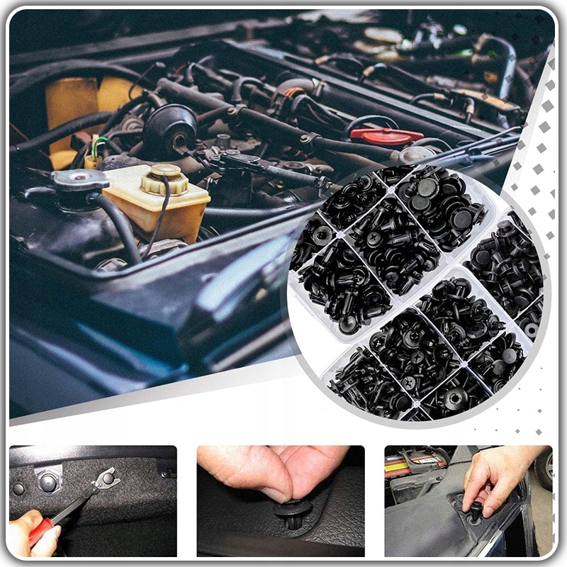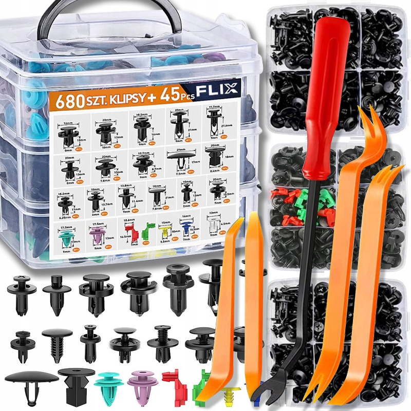 ⭐ Набір з 680 ЕЛЕМЕНТІВ + +45 ЕЛЕМЕНТІВ ТА ІНСТРУМЕНТІВ, який включає 23 найпопулярніші розміри затискачів і кріпильних конекторів. Набір збагачений інструментом для зняття кліпси.