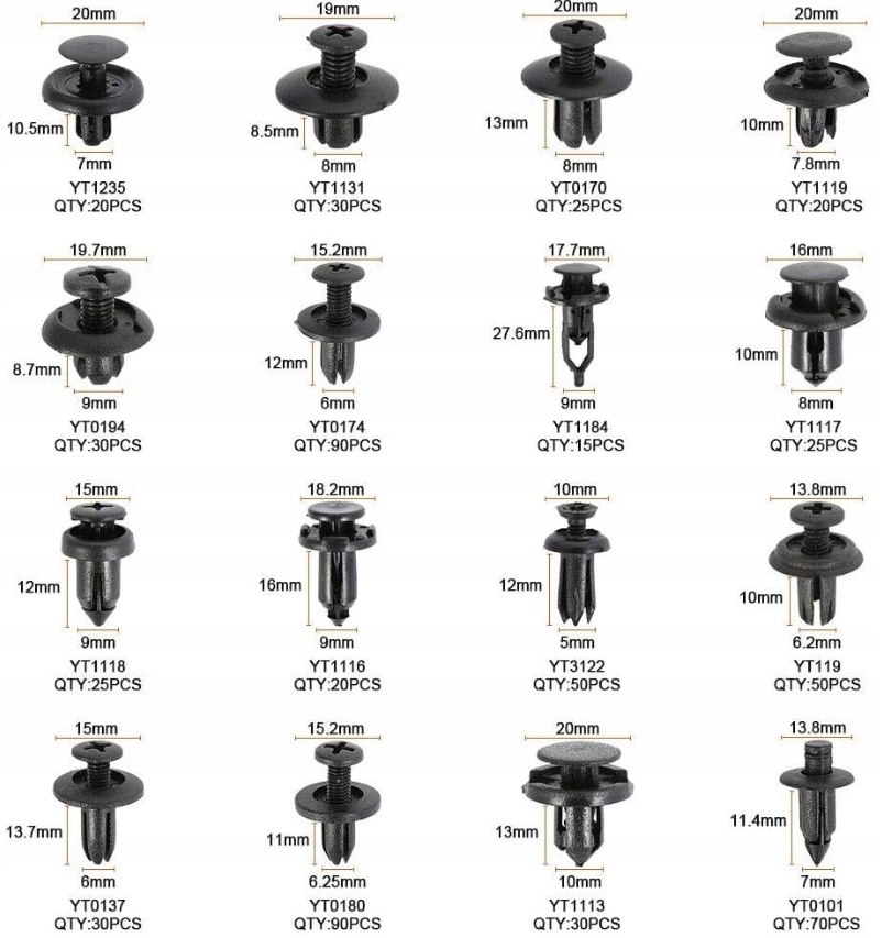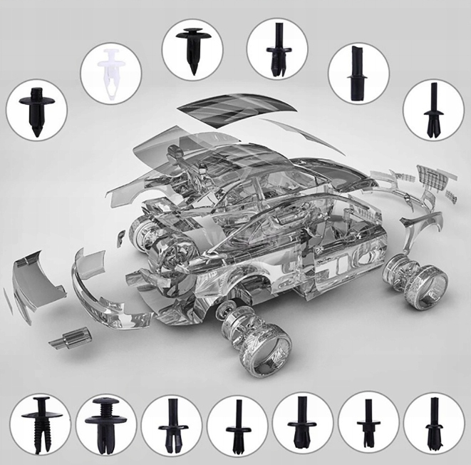 • Універсальний набір різних шпильок , знімних заклепок, кліпс, шпильок, автомобільних засувок для кріплення оббивки в автомобілі. Широко використовується для автомобільних крил, бамперів, дверей та інших деталей автомобіля.