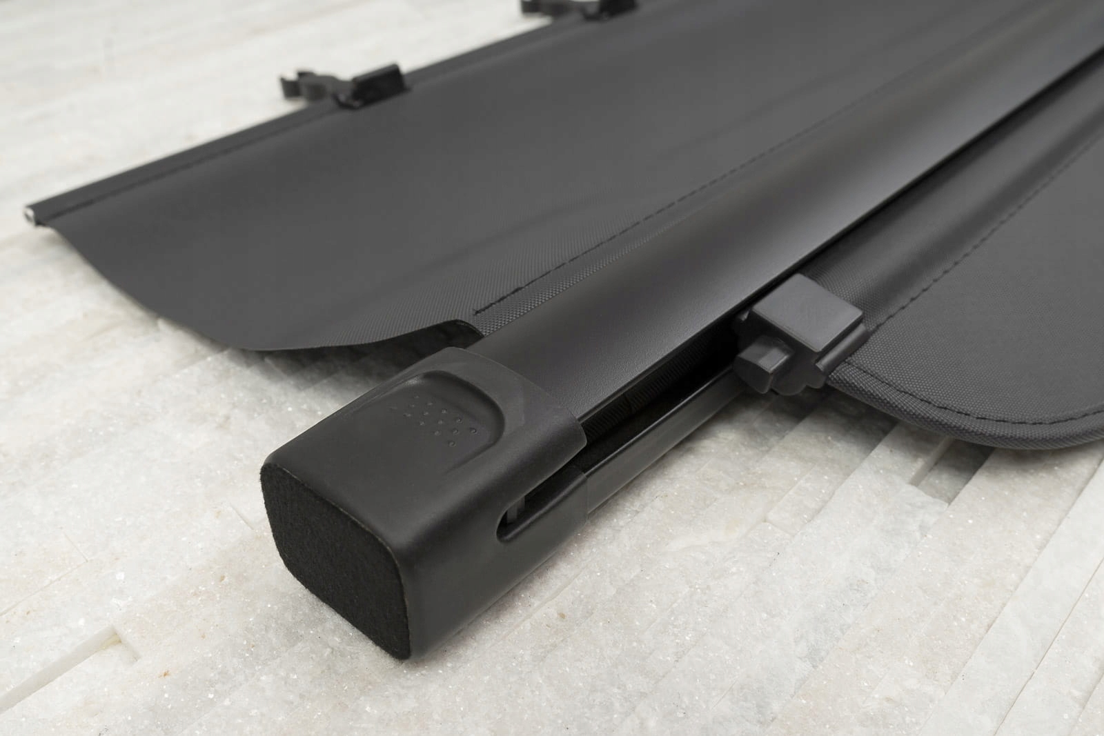 міцна касета і алюмінієва пластина забезпечують довговічність конструкції і зручність використання жалюзі. Касета була розроблена таким чином, щоб її можна було надійно закріпити в оригінальних заводських місцях установки за задніми сидіннями. Додаткові ручки дозволяють розгорнути жалюзі у напрямку до задньої спинки і закріпити їх на підголівниках.е>