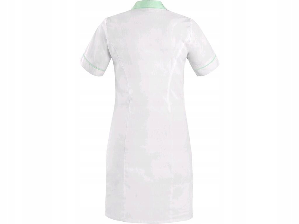 Жіноче плаття з коротким рукавом, облягаюча фігура, відкритий комір додаткового кольору, довжина до колін, закрита застібка на гудзики, лівий нагрудну кишеню, 2 нижніх кишені з вільним нижнім краєм.
