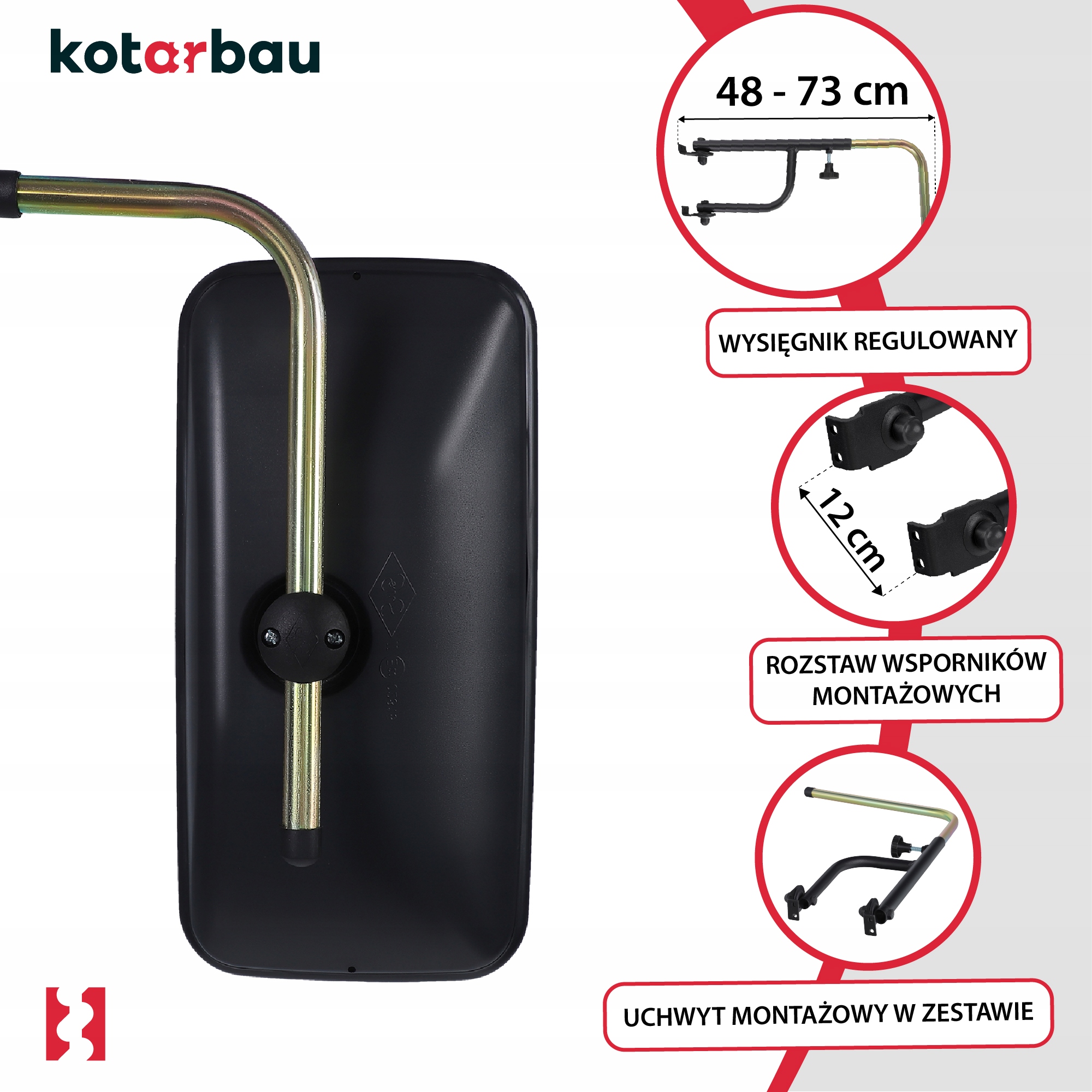 Регульований кронштейн дзеркала можна легко відрегулювати праворуч або ліворуч від кабіни. Оснащений універсальною рамою, забезпечує надійне кріплення до кабіни трактора. Стріла регулюється по довжині від 480 мм до 730 мм, що полегшує установку на транспортний засіб.
