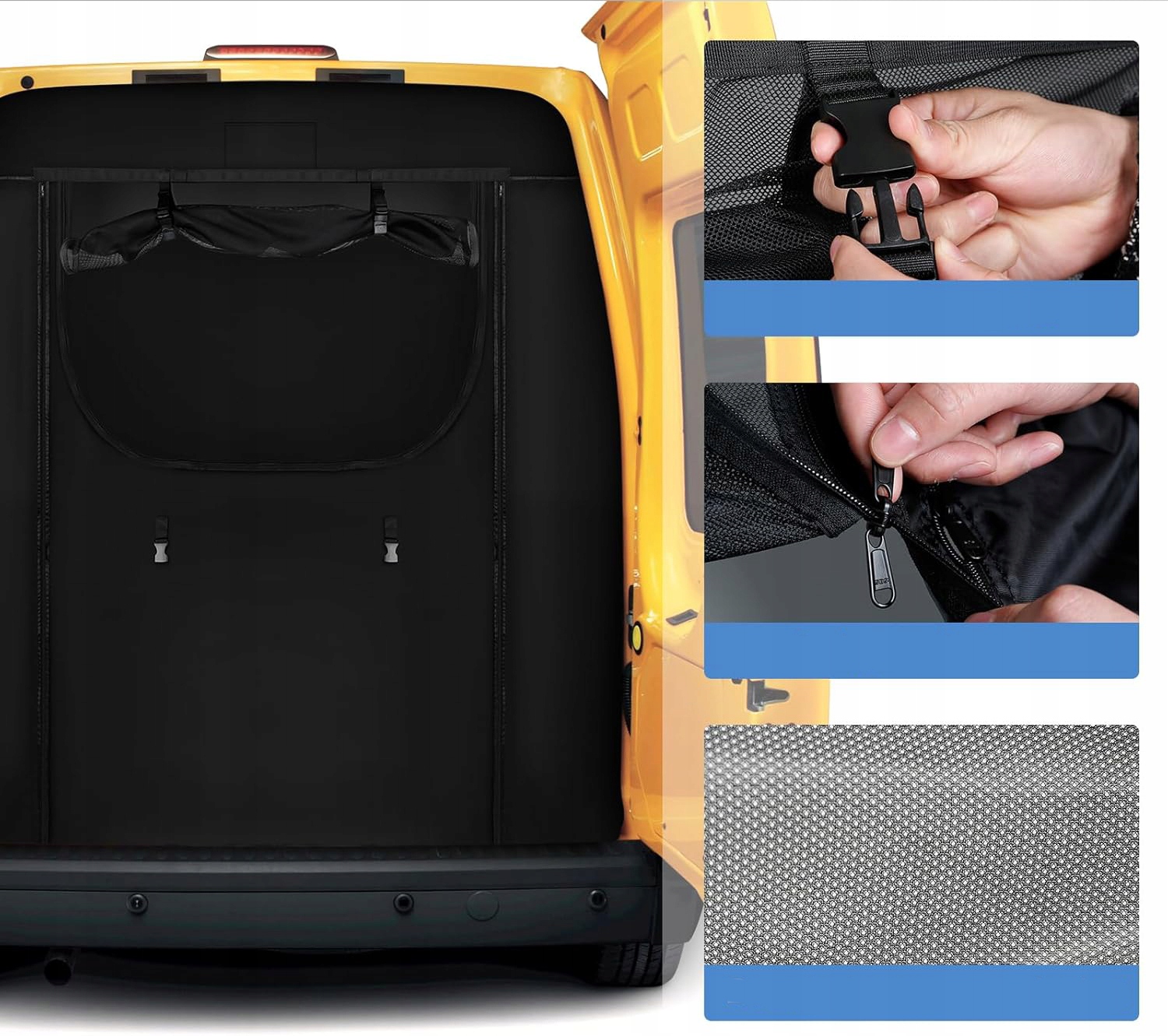 Сітка від комах виготовлена з високоякісного нейлону. Ви можете дивитися крізь нього з салону автомобіля без обмеження видимості. Завдяки отворам діаметром 1 мм покращує циркуляцію повітря в транспортному засобі, захищаючи конфіденційність. Ультратонка сітка не тільки забезпечує комфорт, але й захищає від комах, зберігаючи кемпер чистим і тихим.