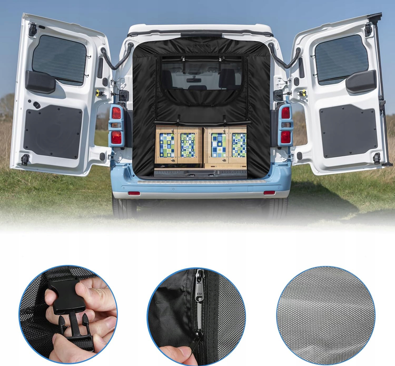 Сітка від комах виготовлена з високоякісного нейлону. Ви можете дивитися крізь нього з салону автомобіля без обмеження видимості. Завдяки отворам діаметром 1 мм покращує циркуляцію повітря в транспортному засобі, захищаючи конфіденційність. Ультратонка сітка не тільки забезпечує комфорт, але й захищає від комах, зберігаючи кемпер чистим і тихим.