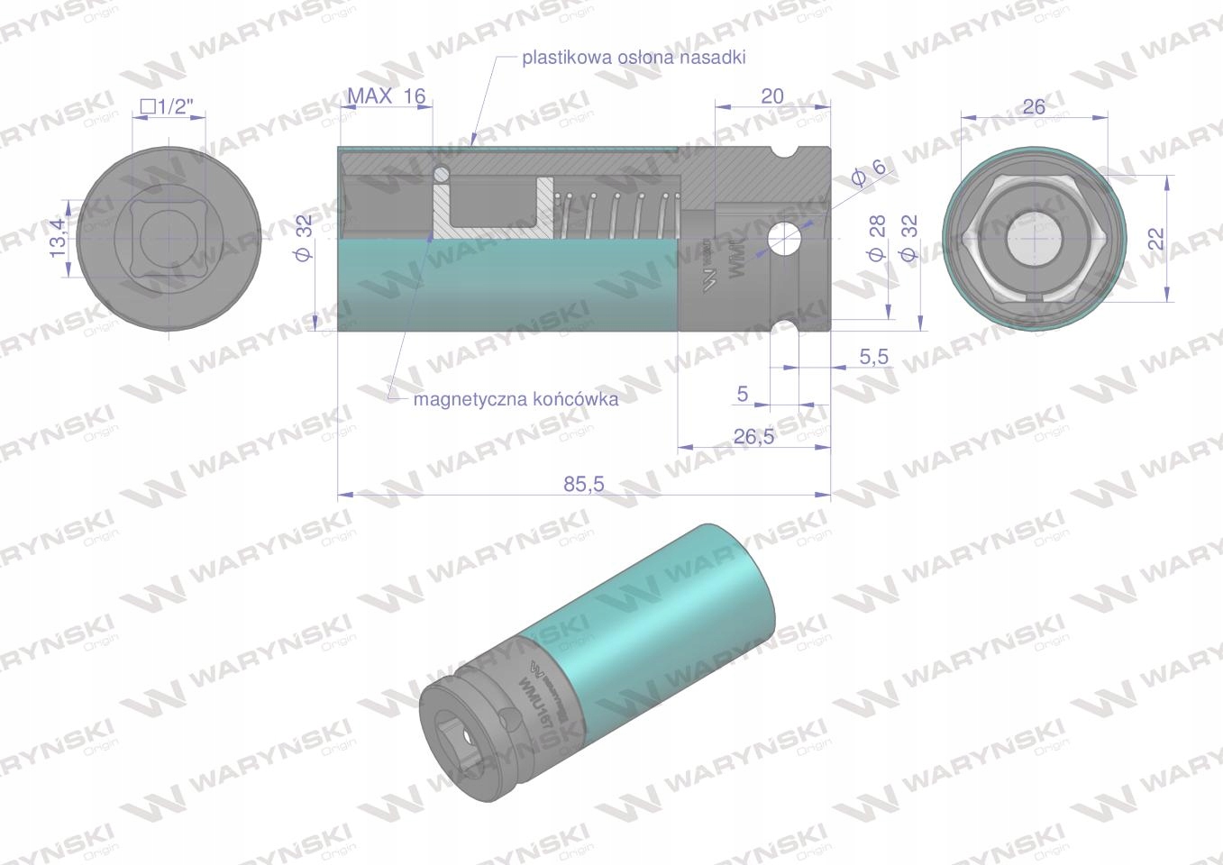 Ударная головка 1/2 из усиленной и ударостойкой хромомолибденовой стали, с магнитом для облегчения работы для снятия гайки или болта с цветовой маркировкой и пластиковой крышкой для алюминиевых дисков Waryński диаметром 22 мм