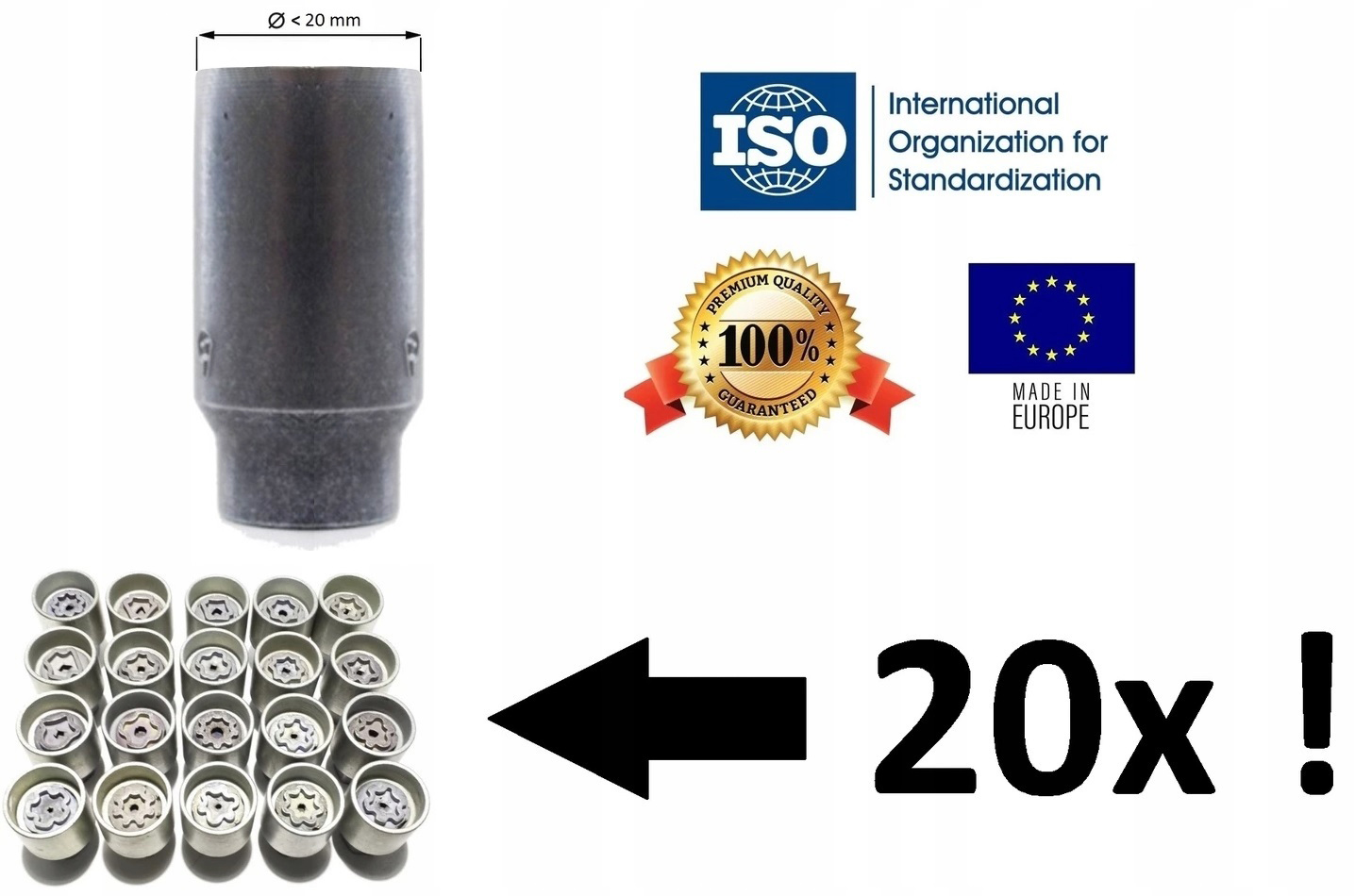 комплект = 4X гайка M12 x 1,25 диаметром ø & lt;20 мм с потайной головкой и направляющей (втулкой) + переходник (переходник) на традиционный ключ с удлинителем.