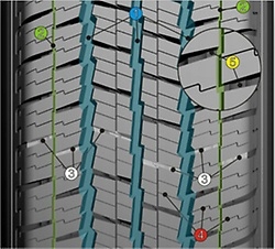 - точно расположенные поперечные зазоры взаимосвязаны, что обеспечивает хорошую устойчивость к аквапланированию при езде по снегу и лужам;