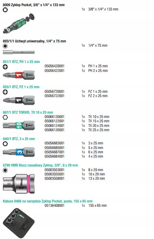 компактный храповик Zyklop с магазином для битов поместится в кармане брюк. Магнитный прямой держатель для бит ½ "и торцевых ключей 3/8" . Очень быстрая замена инструментов благодаря ручке без блокировки. головка с фиксатором в положениях 0°, 15° и 90° позволяет использовать инструмент в качестве храповика и отвертки с храповым механизмом . мелкозубчатый храповик с 72 зубцами позволяет получить небольшой угол возврата храповика всего 5°. Широкий спектр применения Благодаря 12 битам, встроенным в наконечник. Прочный храповой механизм обеспечивает достаточный крутящий момент. Идеальное сочетание храповика Zyklop с набором инструментов для отвертки из 12 предметов. Универсальный держатель для бит 1/4 " длиной 75 мм может использоваться в качестве удлинителя. В комплект входят торцевые ключи наиболее часто используемых размеров. Прочная текстильная кобура 9468 для крепления на ремне, совместимая с компонентами системы Wera 2GO.п>