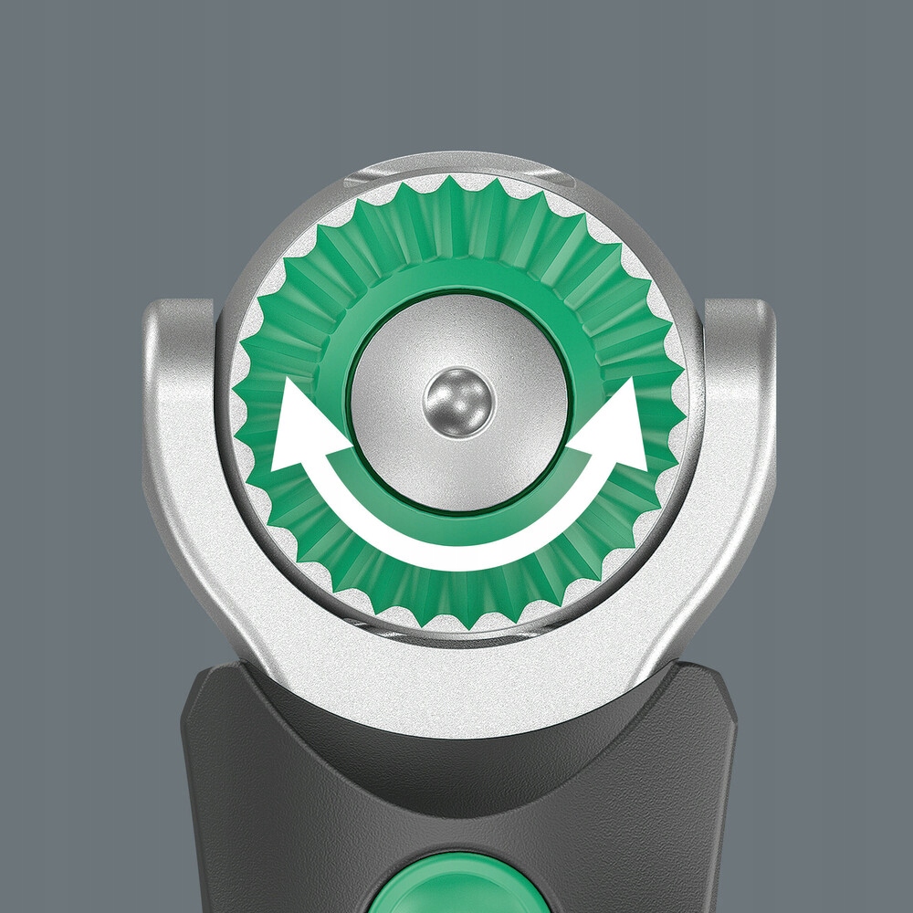 храповик имеет поворотную головку, которую можно зафиксировать в любом положении благодаря расположенному с обеих сторон переключателю блокировки. Это гарантирует бесперебойную работу даже в очень труднодоступных или труднодоступных местах, обеспечивая достаточное пространство для движения рук. Головка может быть установлена в положении 0°, 15° и 90° влево и вправо, что обеспечивает безопасную работу без риска "выскальзывания" головки храповика.п>
